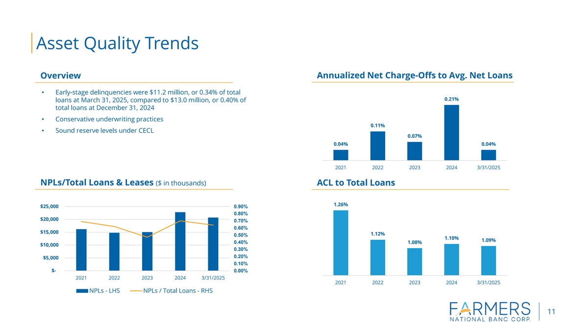 不良債権は2024年12月31日時点の2,280万ドルに対し、2025年3月31日時点では2,070万ドルに減少した。当社は引き続き不良債権を積極的に管理しており、2025年第1四半期中に、総額180万ドルの不良債権1件を「売 却目的保有債権」に指定した。当社は、2025年第2四半期にこの関係の売却が完了すると予想している。2025年3月31日時点の不良債権比率は0.64%(2024年12月31日時点は0.70%)であった。30~89日延滞債権は、2024年12月31日時点では1,300万ドルであったのに対し、2025年3月31日時点では1,120万ドルで、2025年3月31日時点の貸出金合計に占める割合は0.34%であった。