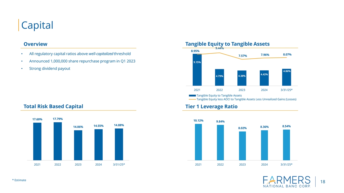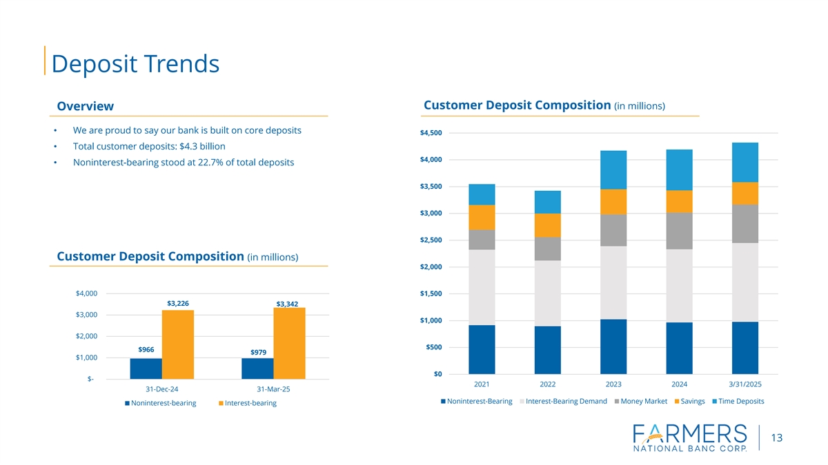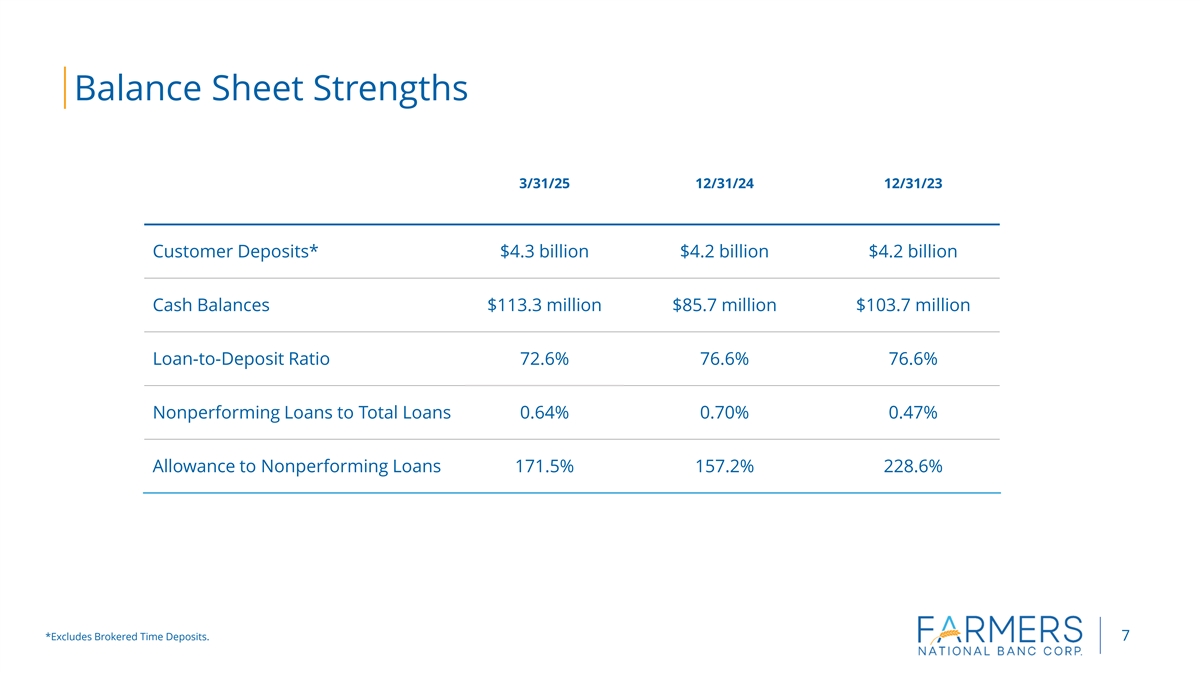 預金総額は2024年12月31日時点の42億7,000万ドルから2025年3月31日時点では44億8,000万ドルに増加した。この2億1,450万ドルの増加は、顧客預金が1億2,950万ドル増加したことに加え、仲介CDが8,500万ドル増加したことによる。顧客預金増加の大部分は、公的資金の季節的な増加によるもので、当四半期は合計1億630万ドルでした。