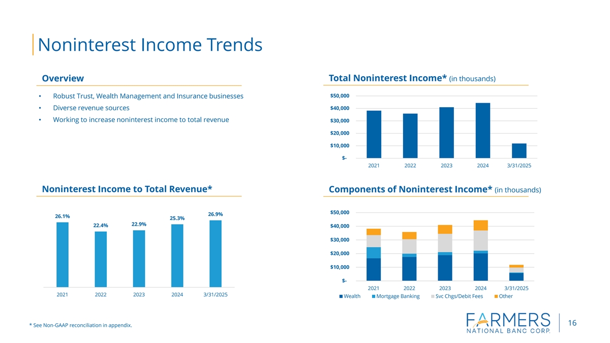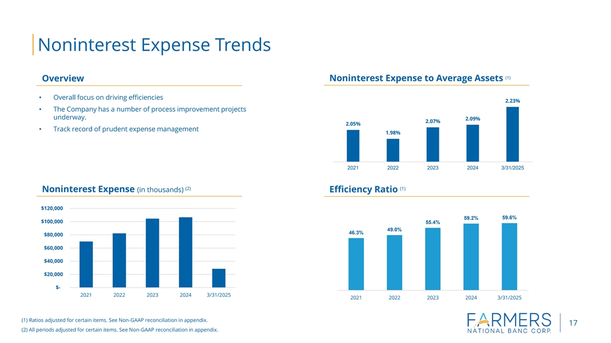 2025 年第 1 四半期には、2024 年第 1 四半期の 3,170 万ドルに対し、3,420 万ドルの純利息利益を計上した。平均受取利息資産は、2024 年第 1 四半期の 48.0 億ドルに対し、2025 年第 1 四半期は 48.9 億ドルに増加しました。これは主に、平均貸出残高が 8,060 万ドル増加したことによるものです。純金利マージンは、2024 年第 1 四半期の 2.70%から、2025 年第 1 四半期は 2.85%に改善しました。純金利マージンが前年同期比で上昇したのは、収益資産の利回りが上昇し、有利子負債の調達コストが低下したためである。2024年9月に始まった米連邦準備制度理事会(FRB)による現在の利下げサイクルは、資金調達コストに大きな影響を与える一方、資産の再価格付けのラグ効果により、収益資産の利回りは引き続き上昇した。利付資産利回りは2024年第1四半期の4.65%から2025年第1四半期には4.74%に上昇し、貸出金と有価証券の利回りはともに上昇した。有利子負債は2024年第1四半期の2.61%から2025年第1四半期には2.52%に低下した。2025 年も純利鞘は拡大すると予想されるが、その程度は今後の米連邦準備制度理事会(FRB)のフェド ファンド金利引き下げ次第である。買収マークおよびPPP利息を除いた非GAAPベースの純利鞘は、2024年第1四半期の2.50%に対し、2025年第1四半期は2.67%となった。