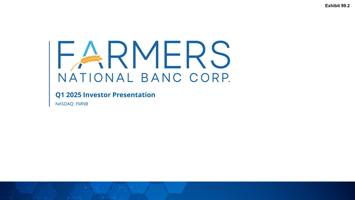 オハイオ州キャンフィールド(2025年4月16日)-ファーマーズ・ナショナル・バンク・コーポレーション(NASDAQ:FMNB)は本日、2025年第1四半期の純利益を1,360万ドル(希薄化後1株当たり0.36ドル)と報告した(2024年第1四半期は1,120万ドル(希薄化後1株当たり0.30ドル))。2025年第1四半期の純利益には、投資有価証券およびその他資産の税引前売却損合計130万ドルが含まれています。これらの項目(非GAAP基準)を除いた2025年第1四半期の純利益は1,460万ドル、希薄化後1株当たり0.39ドルでした。
