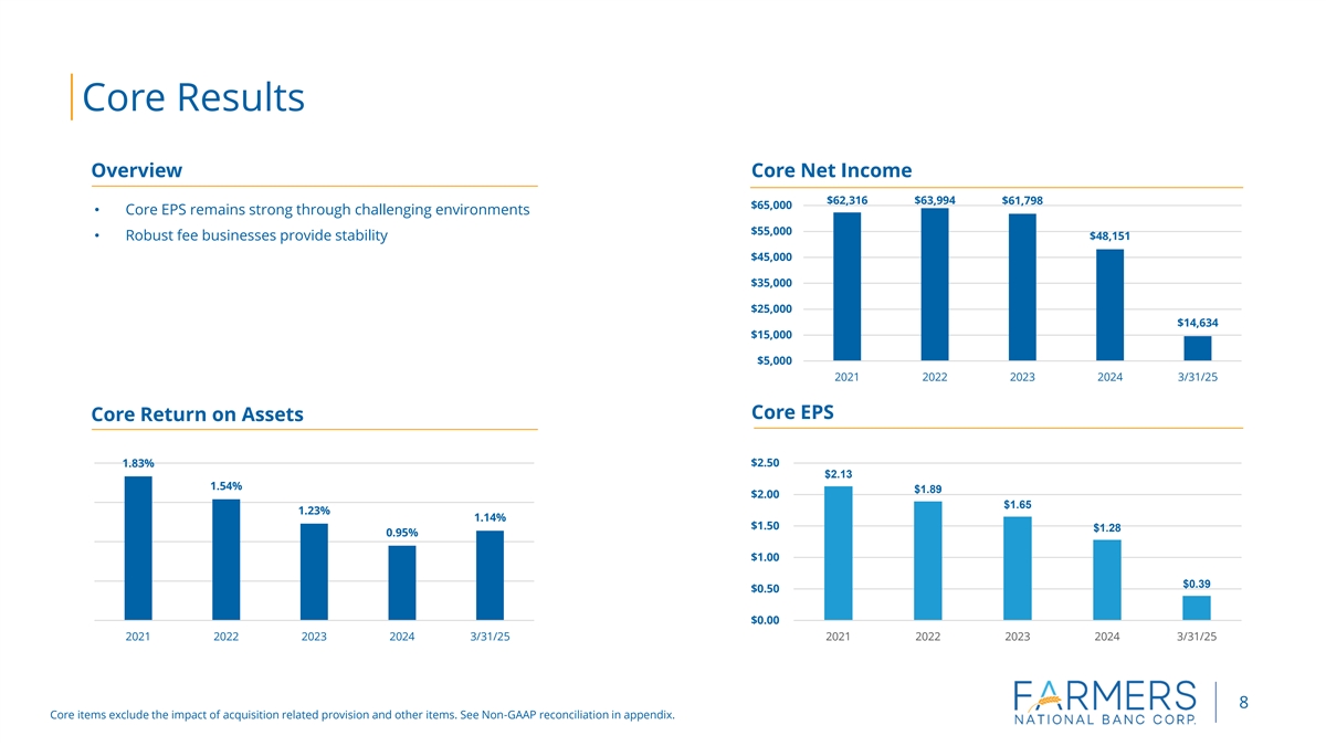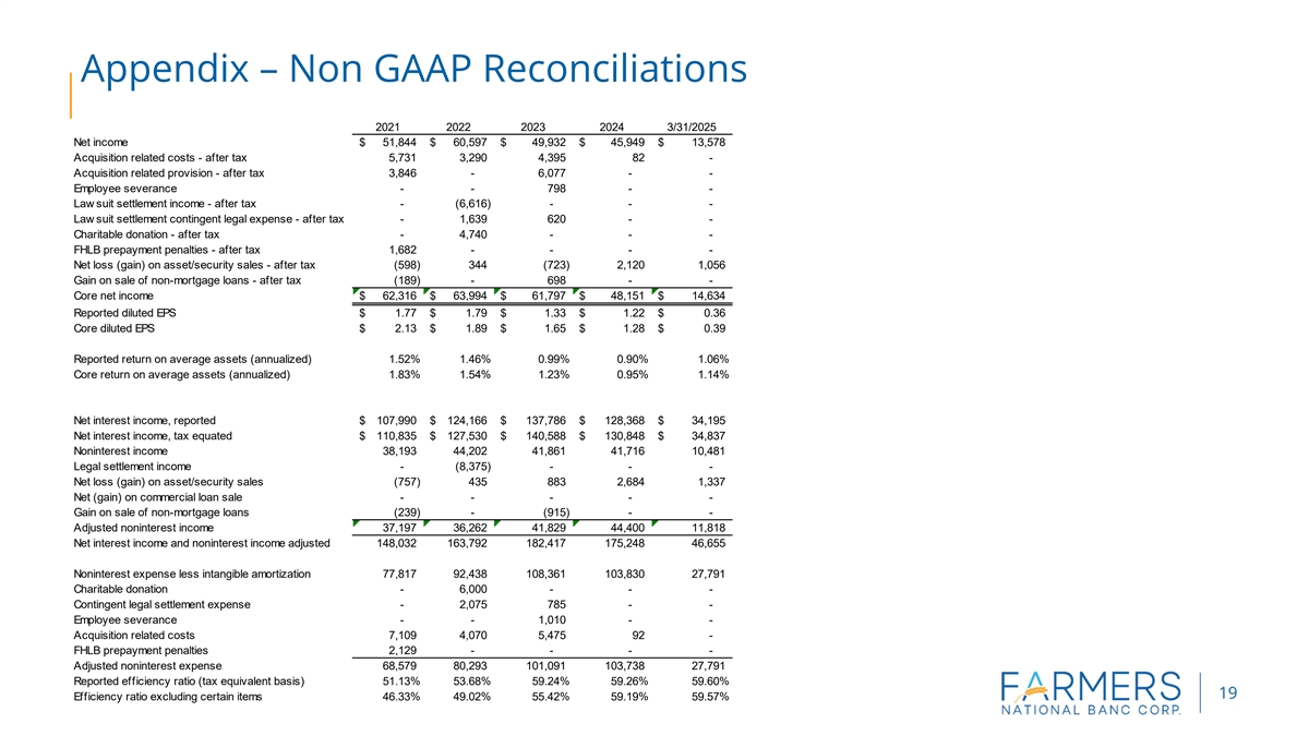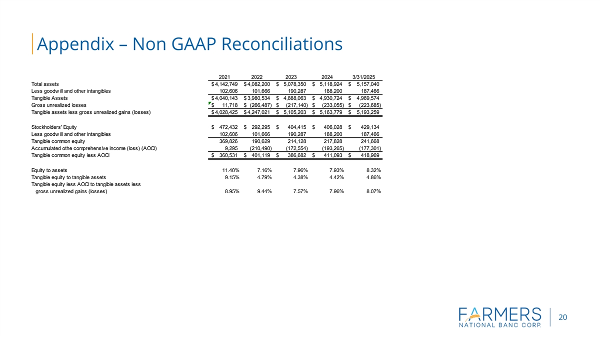 本プレスリリースには、米国で一般に認められた会計原則(GAAP)に準拠して作成されていない財務指標である、ファーマーズの有形自己資本比率、平均有形資産利益率、平均有形自己資本利益率、買収活動に関連する費用および特定の項目を除いた当期純利益、合併費用および特定の項目を除いた平均資産利益率、合併費用および特定の項目を除いた平均自己資本利益率、買収マークおよび関連する増収分を除いた純金利マージン、PPP金利・手数料および効率性比率から特定の項目を控除した数値の開示が含まれています。非GAAP財務指標とは、過去または将来の財務実績、財政状態、キャッシュ・フローを表す数値指標で、GAAPで開示が義務付けられている金額を除外または含むものです。ファーマーズは、これらの非GAAP財務指標により、経営陣と投資家の双方が、基本的な経営成績と傾向、およびファーマーズの市場業績をより完全に理解できると考えています。この追加情報の提示は、GAAPに従って作成された数値と切り離して考慮されたり、その代替となるものではありません。非GAAPベースの財務指標とGAAPベースの財務指標の調整は、以下の連結財務ハイライトに続く表に記載されています。