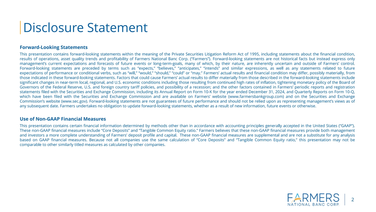 本ニュースリリースおよび関連する投資家向け電話会議では、ファーマーズの財務状況、経営成績、資産の質の動向、収益性に関する記述を含め、1995年私募証券訴訟改革法の定義における将来予想に関する記述を行っています。将来の見通しに関する記述は、過去の事実ではなく、将来の出来事に関する経営陣の現在の予想および予測に過ぎません。将来の見通しに関する記述には、"期待する"、"信じる"、"予想する"、"意図する"、および類似の表現、将来の業績予想に関する記述、または "予定である"、"だろう"、"はずである"、"可能性がある"、"かもしれない "などの条件付き動詞が使用されます。ファーマーズの実際の業績および財務状況は、これらの将来予想に関する記述に示された予想業績および財務状況と異なる可能性があります。ファーマーズの実際の業績が特定の将来見通しに関する記述と大きく異なる可能性のある要因には、高インフレ率の継続、米連邦準備制度理事会(FRB)の金融引き締め、米国および諸外国の関税政策に起因するものを含む、短期的な地域、地方、米国の経済状況の大きな変化が含まれます。2024年12月31日に終了した年度のファーマーズの年次報告書(Form 10-K)、および証券取引委員会(SEC)に提出されたその後の四半期報告書(Form 10-Q)に記載されているその他の要因、およびファーマーズのウェブサイト(www.farmersbankgroup.com)およびSECのウェブサイト(www.sec.gov)で入手できます。将来の見通しに関する記述は、将来の業績を保証するものではなく、その後の日付における経営陣の見解を表すものとして依拠すべきではありません。ファーマーズは、将来予想に関する記述の日付以降に発生する可能性のある状況や事象の影響を反映するために、将来予想に関する記述を更新する義務を負いません。