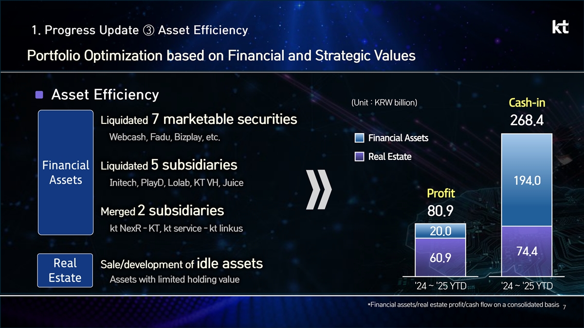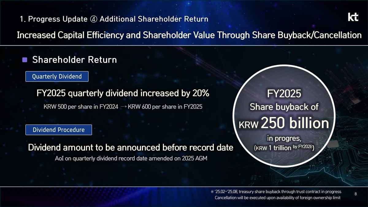 1. Progress Update ③ Asset Efficiency Portfolio Optimization based on Financial and Strategic Values Asset Efficiency (Unit : KRW billion) Cash-in Liquidated 7 marketable securities 268.4 Webcash, Fadu, Bizplay, etc. Financial Assets Real Estate Liquidated 5 subsidiaries 194.0 Initech, PlayD, Lolab, KT VH, Juice Profit Merged2 subsidiaries 80.9 kt NexR – KT, kt service – kt linkus 20.0 74.4 60.9 Sale/development of idle assets Assets with limited holding value '24 ~ '25 YTD '24 ~ '25 YTD *Financial assets/real estate profit/cash flow on a consolidated basis 7
