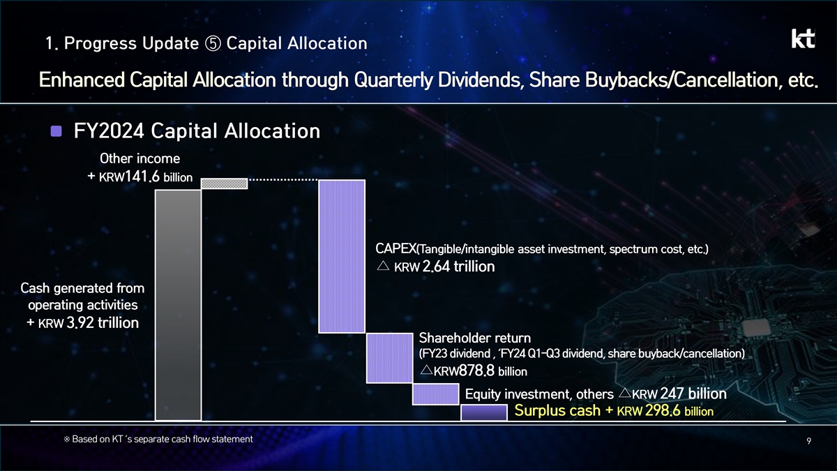 1. Progress Update ④ Additional Shareholder Return Increased Capital Efficiency and Shareholder Value Through Share Buyback/Cancellation Shareholder Return FY2025 quarterly dividend increased by 20% FY2025 KRW 500 per share in FY2024 → KRW 600 per share in FY2025 Share buyback of KRW 250 billion in progres, by FY2028 (KRW 1 trillion ) Dividend amount to be announced before record date AoI on quarterly dividend record date amended on 2025 AGM ※ ‘25.02~’25.08, treasury share buyback through trust contract in progress 8 Cancellation will be executed upon availability of foreign ownership limit