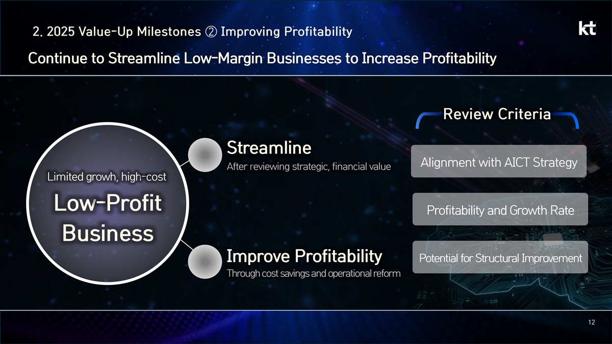 2. 2025 Value-Up Milestones ① AICT Transformation Pursue Growth of B2C and B2B Leveraging AX Capabilities Product, Pricing, Channel AX-Driven Growth Launch an integrated Launch AI agents Develop Korean AI model Launch KT SPC platform for SMEs for mobile and IPTV (Chat GPT-ko, Copilot-ko) (Secure Public Cloud) Develop products and Refine and upgrade Accelerate use case Target priority clients pricing based on AI retail channels rollout by industry Transform work practices through IT/Data Modernization 11