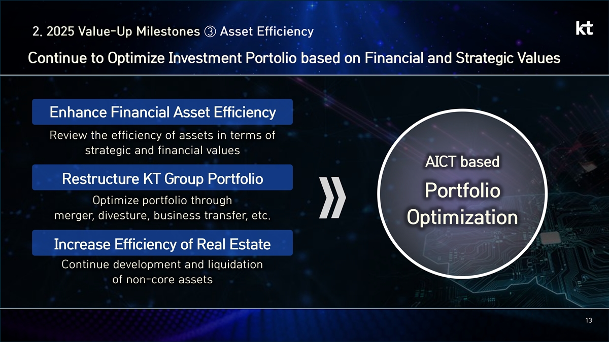 2. 2025 Value-Up Milestones ③ Asset Efficiency Continue to Optimize Investment Portolio based on Financial and Strategic Values Enhance Financial Asset Efficiency Review the efficiency of assets in terms of strategic and financial values AICT based Restructure KT Group Portfolio Portfolio Optimize portfolio through merger, divesture, business transfer, etc. Optimization Increase Efficiency of Real Estate Continue development and liquidation of non-core assets 13