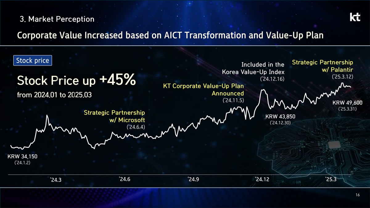 3. Market Perception Corporate Value Increased based on AICT Transformation and Value-Up Plan Strategic Partnership Included in the w/ Palantir Korea Value-Up Index ('25.3.12) (‘24.12.16) Stock Price up +45% KT Corporate Value-Up Plan Announced from 2024.01 to 2025.03 ('24.11.5) KRW 49,600 ('25.3.31) Strategic Partnership KRW 43,850 w/ Microsoft ('24.12.30) ('24.6.4) KRW 34,150 ('24.1.2) '24.6‘24.9‘24.12 '25.3 '24.3 16