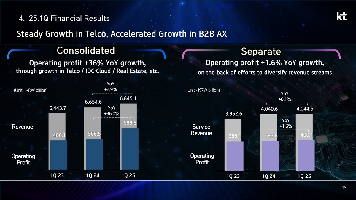 4. '25.1Q Financial Results Steady Growth in Telco, Accelerated Growth in B2B AX Consolidated Separate • Operating profit +1.6% YoY growth, • Operating profit +36% YoY growth, through growth in Telco / IDC・Cloud / Real Estate, etc. • on the back of efforts to diversify revenue streams YoY +2.9% (Unit : KRW billion) (Unit : KRW billion) YoY 6,845.1 +0.1% 6,654.6 YoY 6,443.7 4,044.5 4,040.6 +36.0% 3,952.6 YoY 688.8 +1.6% Revenue Service 506.5 Revenue 400.1 486.1 393.8 388.1 Operating Operating Profit Profit 1Q 23 1Q 24 1Q 25 1Q 23 1Q 24 1Q 25 19