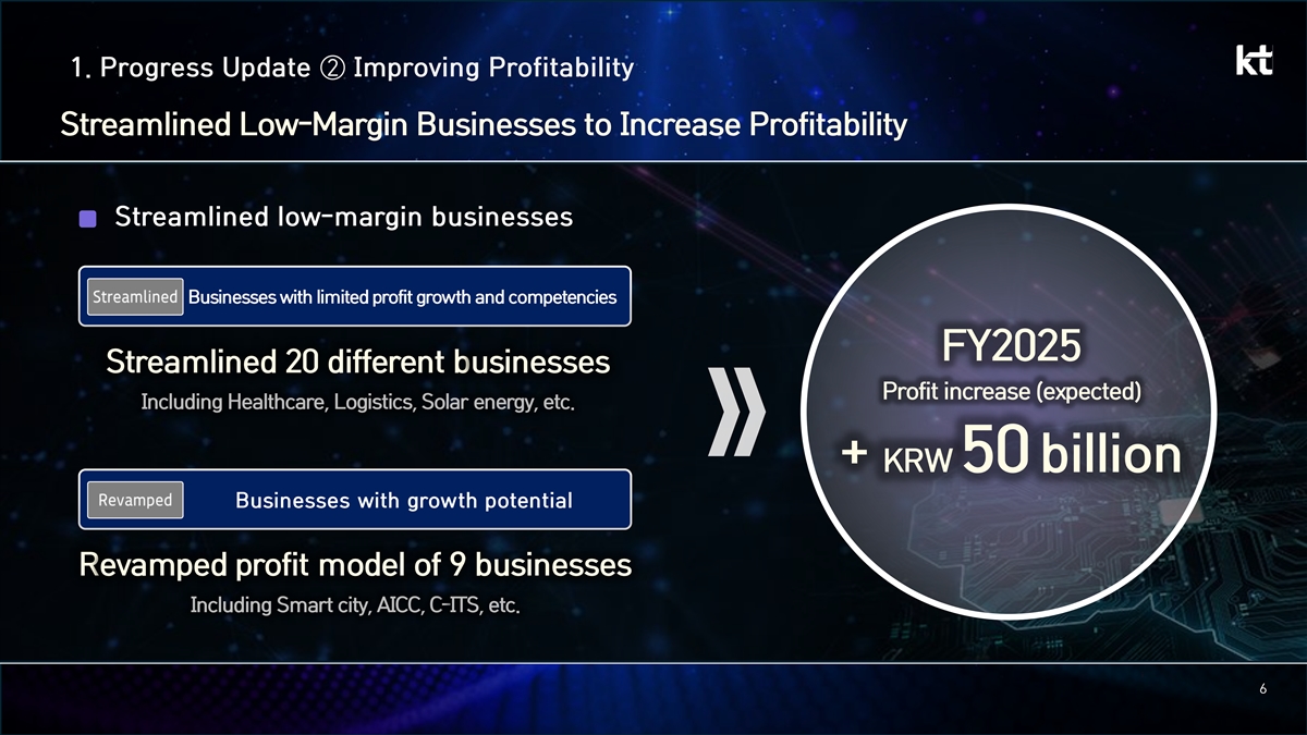 1. Progress Update ① AICT Transformation Initiated AICT Transformation in terms of Business, Workforce, and Capabilities Foundation for AICT Growth Innovation in Business/Workforce/Capabilities Innovation of workforce structure Strategic partnerships w/ big tech companies Restructured on-site workforce (‘24.11) (’24.06 ) (‘25.03) Established network-focused subsidiaries (‘25.01) Advancement of IT workforce and management frameworks Establishment of AX division w/ high expertise Merged ‘kt NexR’ to absorb IT specialists (‘24.12) Launched 'AXD’, AX-specialized division (‘25.03) IT/Data Modernization (in progress) 5