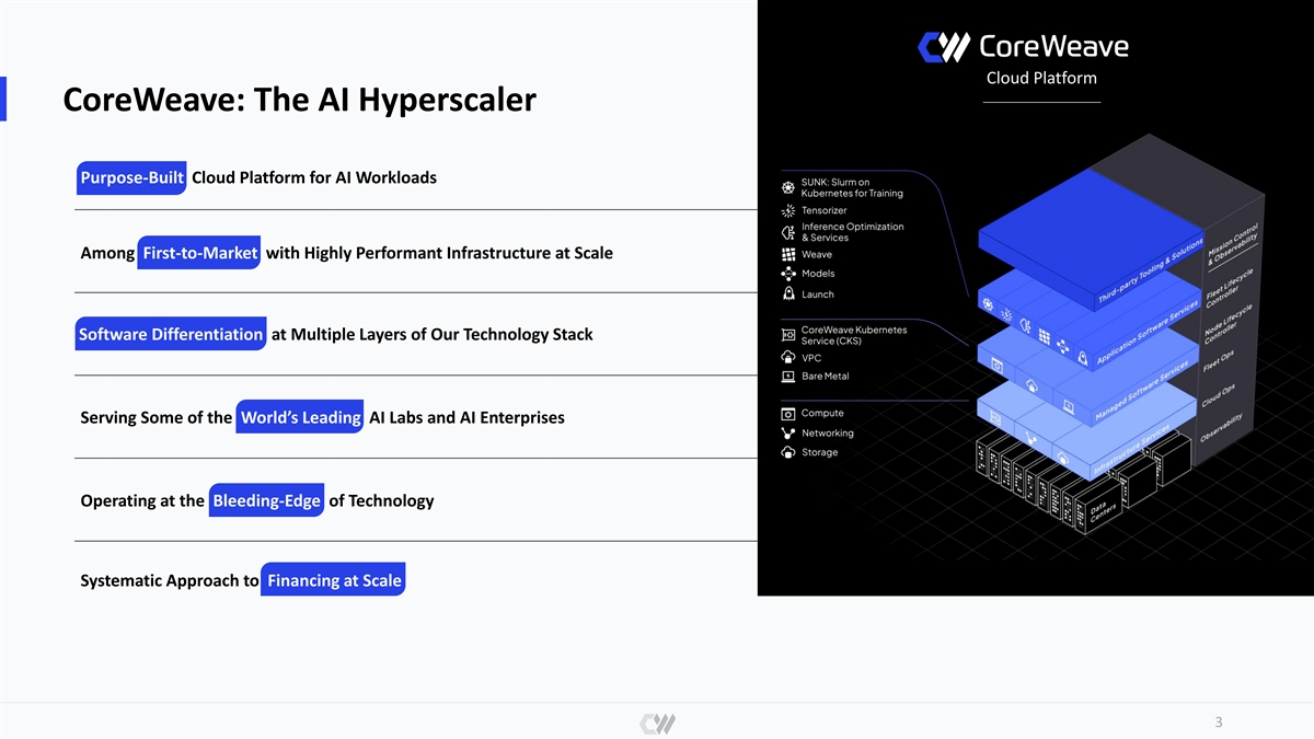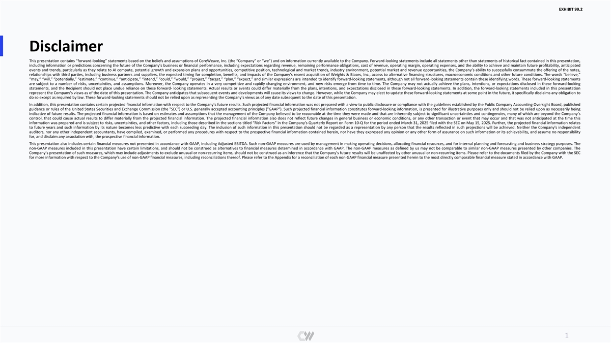 EXHIBIT 99.2 Disclaimer This presentation contains “forward-looking” statements based on the beliefs and assumptions of CoreWeave, Inc. (the “Company” or “we”) and on information currently available to the Company. Forward-looking statements include all statements other than statements of historical fact contained in this presentation, including information or predictions concerning the future of the Company’s business or financial performance, including expectations regarding revenue, remaining performance obligations, cost of revenue, operating margin, operating expenses, and the ability to achieve and maintain future profitability, anticipated events and trends, particularly as they relate to AI compute, potential growth and expansion plans and opportunities, competitive position, technological and market trends, industry environment, potential market and revenue opportunities, the Company’s ability to successfully consummate the offering of the notes, relationships with third parties, including business partners and suppliers, the expected timing for completion, benefits, and impacts of the Company's recent acquisition of Weights & Biases, Inc., access to alternative financing structures, macroeconomic conditions and other future conditions. The words “believe,” “may,” “will,” “potentially,” “estimate,” “continue,” “anticipate,” “intend,” “could,” “would,” “project,” “target,” “plan,” “expect,” and similar expressions are intended to identify forward-looking statements, although not all forward-looking statements contain these identifying words. These forward-looking statements are subject to a number of risks, uncertainties, and assumptions. Moreover, the Company operates in a very competitive and rapidly changing environment, and new risks emerge from time to time. The Company may not actually achieve the plans, intentions, or expectations disclosed in these forward-looking statements, and the Recipient should not place undue reliance on these forward- looking statements. Actual results or events could differ materially from the plans, intentions, and expectations disclosed in these forward-looking statements. In addition, the forward-looking statements included in this presentation represent the Company’s views as of the date of this presentation. The Company anticipates that subsequent events and developments will cause its views to change. However, while the Company may elect to update these forward-looking statements at some point in the future, it specifically disclaims any obligation to do so except as required by law. These forward-looking statements should not be relied upon as representing the Company’s views as of any date subsequent to the date of this presentation. In addition, this presentation contains certain projected financial information with respect to the Company’s future results. Such projected financial information was not prepared with a view to public disclosure or compliance with the guidelines established by the Public Company Accounting Oversight Board, published guidance or rules of the United States Securities and Exchange Commission (the SEC ) or U.S. generally accepted accounting principles ( GAAP ). Such projected financial information constitutes forward‐looking information, is presented for illustrative purposes only and should not be relied upon as necessarily being indicative of future results. The projected financial information is based on estimates and assumptions that the management of the Company believed to be reasonable at the time they were made and that are inherently subject to significant uncertainties and contingencies, many of which are beyond the Company’s control, that could cause actual results to differ materially from the projected financial information. The projected financial information also does not reflect future changes in general business or economic conditions, or any other transaction or event that may occur and that was not anticipated at the time this information was prepared and is subject to risks, uncertainties, and other factors, including those described in the sections titled “Risk Factors” in the Company's Quarterly Report on Form 10-Q for the period ended March 31, 2025 filed with the SEC on May 15, 2025. Further, the projected financial information relates to future years and such information by its nature becomes less predictive with each succeeding day. The inclusion of such information in this presentation should not be regarded as a representation by any person that the results reflected in such projections will be achieved. Neither the Company's independent auditors, nor any other independent accountants, have compiled, examined, or performed any procedures with respect to the prospective financial information contained herein, nor have they expressed any opinion or any other form of assurance on such information or its achievability, and assume no responsibility for, and disclaim any association with, the prospective financial information. This presentation also includes certain financial measures not presented in accordance with GAAP, including Adjusted EBITDA. Such non-GAAP measures are used by management in making operating decisions, allocating financial resources, and for internal planning and forecasting and business strategy purposes. The non-GAAP measures included in this presentation have certain limitations, and should not be construed as alternatives to financial measures determined in accordance with GAAP. The non-GAAP measures as defined by us may not be comparable to similar non-GAAP measures presented by other companies. The Company’s presentation of such measures, which may include adjustments to exclude unusual or non-recurring items, should not be construed as an inference that the Company’s future results will be unaffected by other unusual or non-recurring items. Please refer to the documents fi