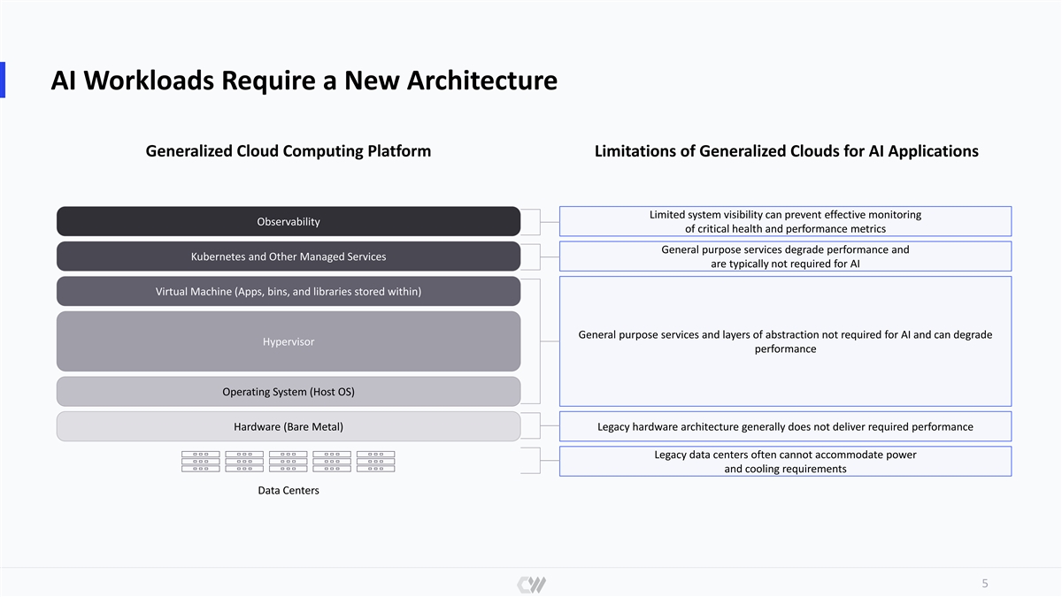 Parallelized Workloads are Fundamentally Different Today’s traditional cloud compute platforms are not optimized for the parallelized workloads of AI Serialized Workloads Parallelized Workloads SaaS Generative and VFX and High-Frequency Website Hosting Databases Email Systems Drug Discovery Applications Agentic AI Rendering Trading Single Chip Failure Single Chip Failure If… If… Simple Tasks Offloaded to Other Processors Entire Job Fails, Massive Waste of Compute Resources Then Then 4
