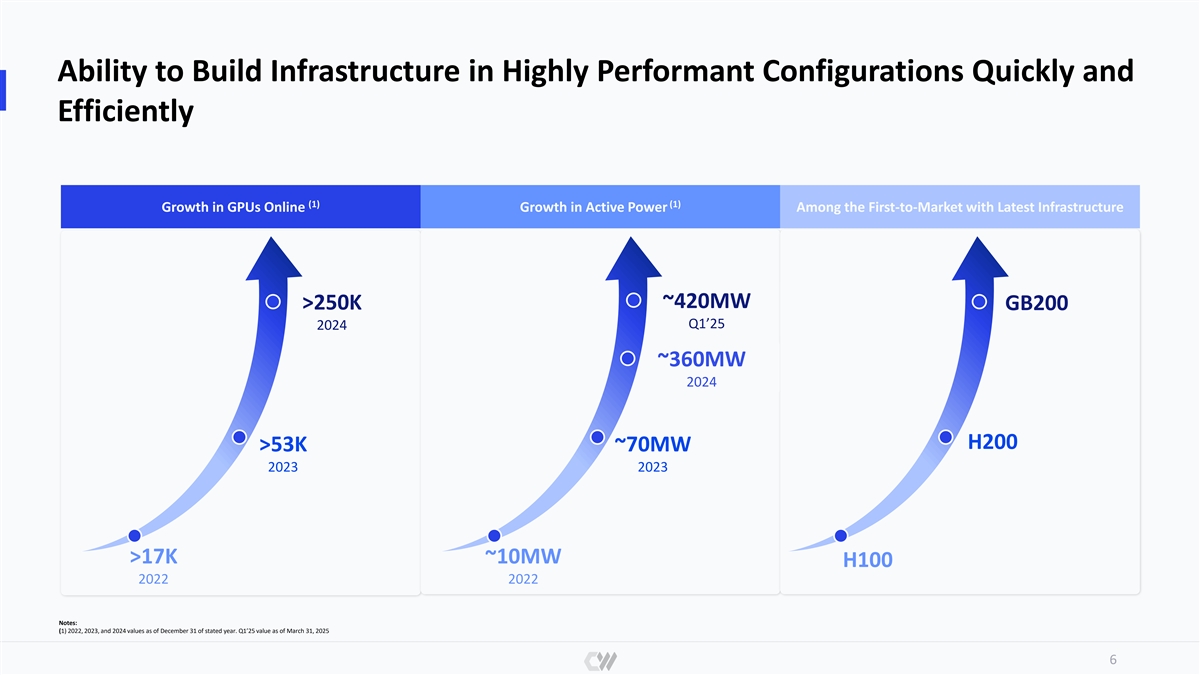 AI Workloads Require a New Architecture Generalized Cloud Computing Platform Limitations of Generalized Clouds for AI Applications Limited system visibility can prevent effective monitoring Observability of critical health and performance metrics General purpose services degrade performance and Kubernetes and Other Managed Services are typically not required for AI Virtual Machine (Apps, bins, and libraries stored within) General purpose services and layers of abstraction not required for AI and can degrade Hypervisor performance Operating System (Host OS) Hardware (Bare Metal) Legacy hardware architecture generally does not deliver required performance Legacy data centers often cannot accommodate power and cooling requirements Data Centers 5