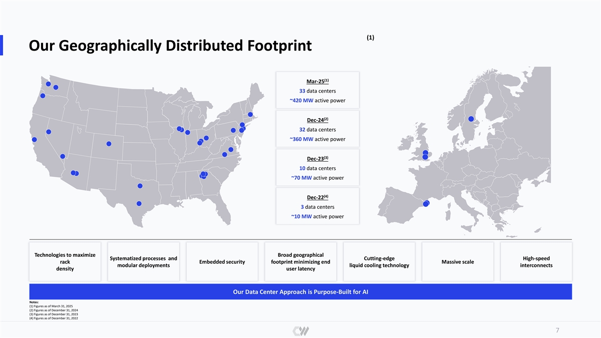 Ability to Build Infrastructure in Highly Performant Configurations Quickly and Efficiently (1) (1) Growth in GPUs Online Growth in Active Power Among the First-to-Market with Latest Infrastructure ~420MW >250K GB200 Q1’25 2024 ~360MW 2024 H200 >53K ~70MW 2023 2023 >17K ~10MW H100 2022 2022 Notes: (1) 2022, 2023, and 2024 values as of December 31 of stated year. Q1’25 value as of March 31, 2025 6