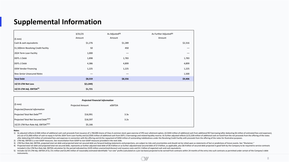 Supplemental Information (1) (1) 3/31/25 As Adjusted As Further Adjusted Amount Amount Amount ($ mm) Cash & cash equivalents $1,276 $1,289 $2,316 $1,500mm Revolving Credit Facility 50 450 –– 2024 Term Loan Facility 1,000 –– –– DDTL-1 Debt 1,898 1,783 1,783 DDTL-2 Debt 4,386 4,899 4,899 OEM Vendor Financing 1,225 1,225 1,225 New Senior Unsecured Notes –– –– 1,500 Total Debt $8,559 $8,356 $9,406 1Q’25 LTM Net Loss $(1,049) (2) 1Q'25 LTM Adj. EBITDA $1,721 Projected Financial Information ($ mm) Projected Amount xEBITDA Projected financial information (3)(4) Projected Total Net Debt $16,991 3.3x (3)(4) Projected Total Net Secured Debt $16,597 3.2x (3)(5) 1Q'25 LTM Run-Rate Adj. EBITDA $5,166 Notes: 1) As adjusted reflects (i) $68 million of additional cash cash proceeds from issuance of 1,760,000 shares of Class A common stock upon exercise of IPO over-allotment option, (ii) $444 million of additional cash from additional RCF borrowing (after deducting $6 million of estimated fees and expenses), (iii) use of $1,000 million of cash to repay in full the 2024 Term Loan Facility and (iv) $505 million of additional cash from DDTL-2 borrowings and related liquidity reserve. As further adjusted reflects (i) $1,028 million of additional cash on hand from the net proceeds from the offering of the notes after deducting $23 million of estimated fees and expenses in connection with the offering and (ii) the repayment of $450 million of outstanding indebtedness under the Revolving Credit Facility with proceeds from the offering of the notes for illustrative purposes. 2) LTM Adj. EBITDA is a non-GAAP measures. See reconciliation from GAAP to non-GAAP measures provided in the next slide. 3) LTM Run-Rate Adj. EBITDA, projected total net debt and projected total net secured debt are forward-looking statements and projections, are subject to risks and uncertainties and should not be relied upon as statements of fact or predictions of future events. See “Disclaimer.” 4) Projected total net debt and projected total net secured debt, represents as further adjusted total debt of $9.4 billion or as further adjusted total secured debt of $7.9 billion, as applicable, plus $8.9 billion of secured debt projected in good faith by the Company to be required to service contracts included in the LTM Run-Rate Adj. EBITDA calculation for the period indicated less $229 million unamortized discount and issuance costs and $1.1 billion of expected cash and cash equivalents. 5) Includes Q1’25 LTM Adj. EBITDA of $1,721 million and $3,445 million of reasonably estimated identifiable “run-rate” profits (calculated on a pre-tax basis) projected to be earned from contracts within 24 months of the entry into such contracts as permitted under certain of the Company’s debt instruments. 8