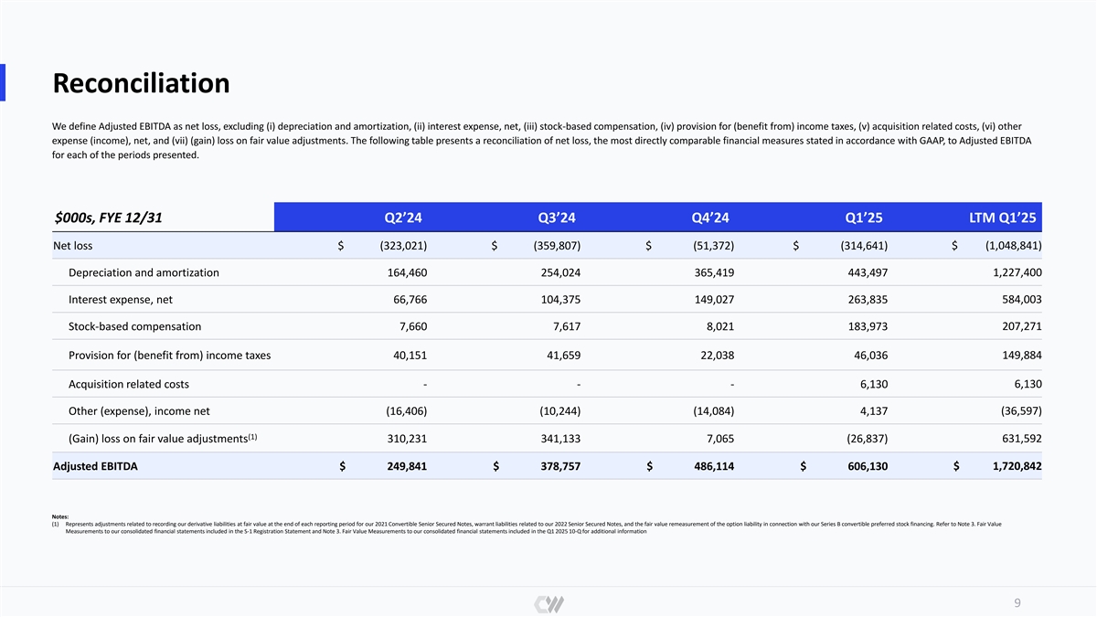 Reconciliation We define Adjusted EBITDA as net loss, excluding (i) depreciation and amortization, (ii) interest expense, net, (iii) stock-based compensation, (iv) provision for (benefit from) income taxes, (v) acquisition related costs, (vi) other expense (income), net, and (vii) (gain) loss on fair value adjustments. The following table presents a reconciliation of net loss, the most directly comparable financial measures stated in accordance with GAAP, to Adjusted EBITDA for each of the periods presented. $000s, FYE 12/31 Q2’24 Q3’24 Q4’24 Q1’25 LTM Q1’25 Net loss $ (323,021) $ (359,807) $ (51,372) $ (314,641) $ (1,048,841) Depreciation and amortization 164,460 254,024 365,419 443,497 1,227,400 Interest expense, net 66,766 104,375 149,027 263,835 584,003 Stock-based compensation 7,660 7,617 8,021 183,973 207,271 Provision for (benefit from) income taxes 40,151 41,659 22,038 46,036 149,884 Acquisition related costs - - - 6,130 6,130 (36,597) Other (expense), income net (16,406) (10,244) (14,084) 4,137 (1) (Gain) loss on fair value adjustments 310,231 341,133 7,065 (26,837) 631,592 Adjusted EBITDA $ 249,841 $ 378,757 $ 486,114 $ 606,130 $ 1,720,842 Notes: (1) Represents adjustments related to recording our derivative liabilities at fair value at the end of each reporting period for our 2021 Convertible Senior Secured Notes, warrant liabilities related to our 2022 Senior Secured Notes, and the fair value remeasurement of the option liability in connection with our Series B convertible preferred stock financing. Refer to Note 3. Fair Value Measurements to our consolidated financial statements included in the S-1 Registration Statement and Note 3. Fair Value Measurements to our consolidated financial statements included in the Q1 2025 10-Q for additional information 9