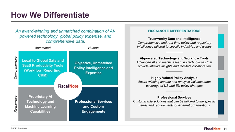 Proprietary Infrastructure and Expert Intelligence Differentiators that are more than a decade in the making Ingestion Processing Sources Merge Modular collection ● Multimodal data sources framework (text, audio, video) Normalize ● Government regulation, legislation, Smart Scrapers and policy data (local, state, federal) ● Data across countries, news, social, Clean financial documents Reprocessing ● Millions of documents in different formats (pdfs, text formats, multiple APIs Extract languages) ● Different structure of source sites, changing data Metadata Monitor Data augmented with proprietary AI and expert (human) insights, providing comprehensive and differentiated value for customers. © 2025 FiscalNote 10