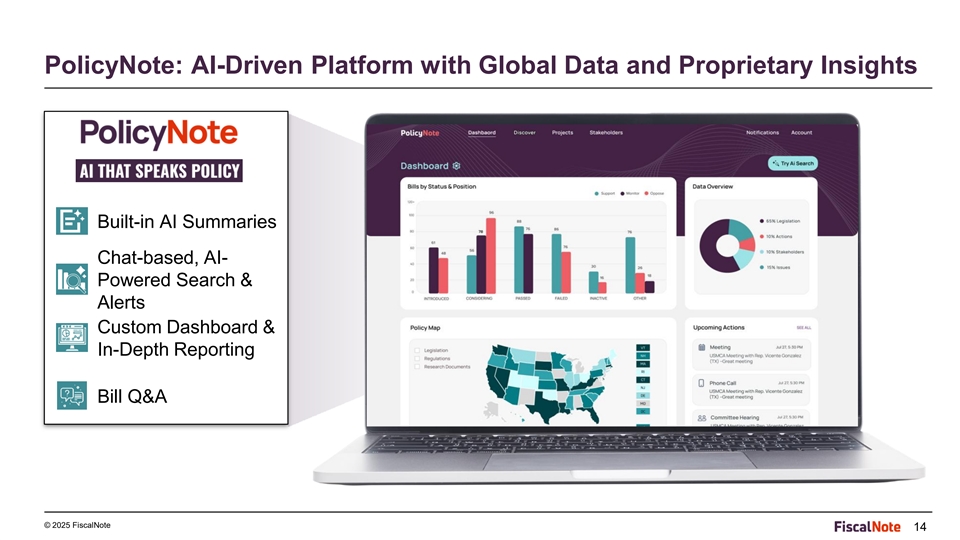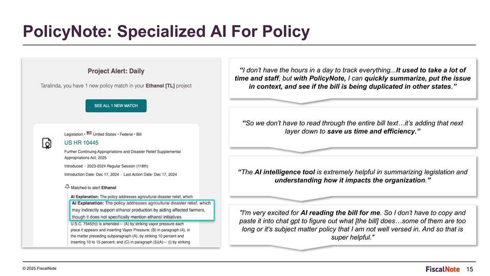 PolicyNote: AI-Driven Platform with Global Data and Proprietary Insights Built-in AI Summaries Chat-based, AI- Powered Search & Alerts Custom Dashboard & In-Depth Reporting Bill Q&A © 2025 FiscalNote 14