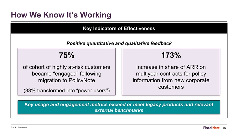 How We Know It’s Working Key Indicators of Effectiveness Positive quantitative and qualitative feedback 75% 173% of cohort of highly at-risk customers Increase in share of ARR on became “engaged” following multiyear contracts for policy migration to PolicyNote information from new corporate customers (33% transformed into “power users”) Key usage and engagement metrics exceed or meet legacy products and relevant external benchmarks © 2025 FiscalNote 16