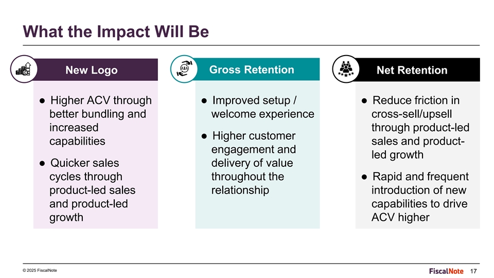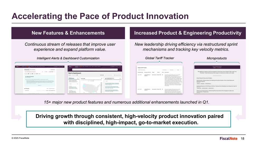 What the Impact Will Be Gross Retention New Logo Net Retention ● Higher ACV through ● Improved setup / ● Reduce friction in better bundling and welcome experience cross-sell/upsell increased through product-led ● Higher customer capabilities sales and product- engagement and led growth ● Quicker sales delivery of value cycles through throughout the ● Rapid and frequent product-led sales relationship introduction of new and product-led capabilities to drive growth ACV higher © 2025 FiscalNote 17