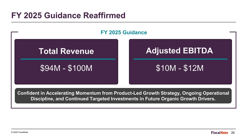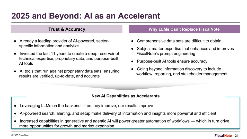 FY 2025 Guidance Reaffirmed FY 2025 Guidance Commentary Adjusted EBITDA Total Revenue $94M - $100M $10M - $12M Confident in Accelerating Momentum from Product-Led Growth Strategy, Ongoing Operational Discipline, and Continued Targeted Investments in Future Organic Growth Drivers. © 2025 FiscalNote 20