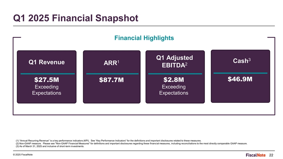 2025 and Beyond: AI as an Accelerant Why LLMs Can’t Replace FiscalNote Trust & Accuracy ● Already a leading provider of AI-powered, sector- ● Comprehensive data sets are difficult to obtain specific information and analytics ● Subject matter expertise that enhances and improves ● Invested the last 11 years to create a deep reservoir of FiscalNote’s prompt engineering technical expertise, proprietary data, and purpose-built ● Purpose-built AI tools ensure accuracy AI tools ● Going beyond information discovery to include ● AI tools that run against proprietary data sets, ensuring workflow, reporting, and stakeholder management results are verified, up-to-date, and accurate New AI Capabilities as Accelerants ● Leveraging LLMs on the backend — as they improve, our results improve ● AI-powered search, alerting, and setup make delivery of information and insights more powerful and efficient ● Increased capabilities in generative and agentic AI will power greater automation of workflows — which in turn drive more opportunities for growth and market expansion © 2025 FiscalNote 21