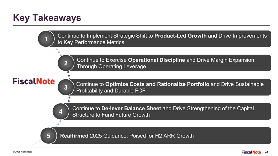 Key Takeaways Continue to Implement Strategic Shift to Product-Led Growth and Drive Improvements 1 to Key Performance Metrics Continue to Exercise Operational Discipline and Drive Margin Expansion 2 Through Operating Leverage Continue to Optimize Costs and Rationalize Portfolio and Drive Sustainable 3 Profitability and Durable FCF Continue to De-lever Balance Sheet and Drive Strengthening of the Capital 4 Structure to Fund Future Growth Reaffirmed 2025 Guidance; Poised for H2 ARR Growth 5 © 2025 FiscalNote 24