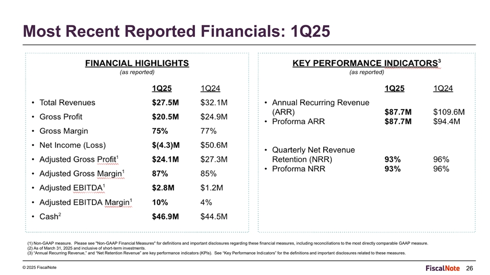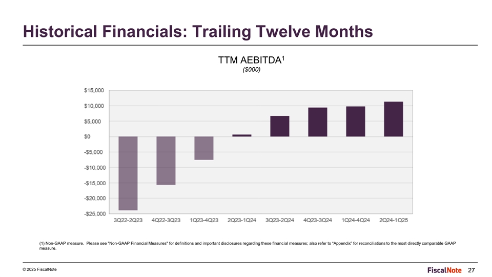 Most Recent Reported Financials: 1Q25 (1) Non-GAAP measure. Please see Non-GAAP Financial Measures for definitions and important disclosures regarding these financial measures, including reconciliations to the most directly comparable GAAP measure. (2) As of March 31, 2025 and inclusive of short-term investments. (3) “Annual Recurring Revenue,” and “Net Retention Revenue” are key performance indicators (KPIs). See “Key Performance Indicators” for the definitions and important disclosures related to these measures. © 2025 FiscalNote 26