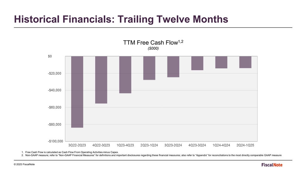 Historical Financials: Trailing Twelve Months 1,2 TTM Free Cash Flow ($000) 1. Free Cash Flow is calculated as Cash Flow From Operating Activities minus Capex. 2. Non-GAAP measure; refer to “Non-GAAP Financial Measures” for definitions and important disclosures regarding these financial measures; also refer to “Appendix” for reconciliations to the most directly comparable GAAP measure © 2025 FiscalNote