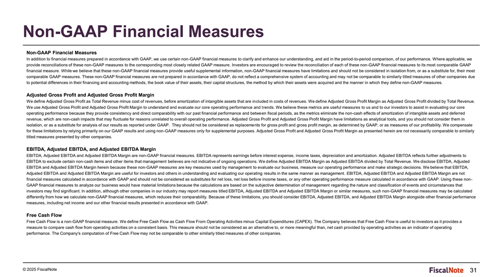 Non-GAAP Financial Measures Non-GAAP Financial Measures In addition to financial measures prepared in accordance with GAAP, we use certain non-GAAP financial measures to clarify and enhance our understanding, and aid in the period-to-period comparison, of our performance. Where applicable, we provide reconciliations of these non-GAAP measures to the corresponding most closely related GAAP measure. Investors are encouraged to review the reconciliation of each of these non-GAAP financial measures to its most comparable GAAP financial measure. While we believe that these non-GAAP financial measures provide useful supplemental information, non-GAAP financial measures have limitations and should not be considered in isolation from, or as a substitute for, their most comparable GAAP measures. These non-GAAP financial measures are not prepared in accordance with GAAP, do not reflect a comprehensive system of accounting and may not be comparable to similarly titled measures of other companies due to potential differences in their financing and accounting methods, the book value of their assets, their capital structures, the method by which their assets were acquired and the manner in which they define non-GAAP measures. Adjusted Gross Profit and Adjusted Gross Profit Margin We define Adjusted Gross Profit as Total Revenue minus cost of revenues, before amortization of intangible assets that are included in costs of revenues. We define Adjusted Gross Profit Margin as Adjusted Gross Profit divided by Total Revenue. We use Adjusted Gross Profit and Adjusted Gross Profit Margin to understand and evaluate our core operating performance and trends. We believe these metrics are useful measures to us and to our investors to assist in evaluating our core operating performance because they provide consistency and direct comparability with our past financial performance and between fiscal periods, as the metrics eliminate the non-cash effects of amortization of intangible assets and deferred revenue, which are non-cash impacts that may fluctuate for reasons unrelated to overall operating performance. Adjusted Gross Profit and Adjusted Gross Profit Margin have limitations as analytical tools, and you should not consider them in isolation, or as a substitute for analysis of our results as reported under GAAP. They should not be considered as replacements for gross profit and gross profit margin, as determined by GAAP, or as measures of our profitability. We compensate for these limitations by relying primarily on our GAAP results and using non-GAAP measures only for supplemental purposes. Adjusted Gross Profit and Adjusted Gross Profit Margin as presented herein are not necessarily comparable to similarly titled measures presented by other companies. EBITDA, Adjusted EBITDA, and Adjusted EBITDA Margin EBITDA, Adjusted EBITDA and Adjusted EBITDA Margin are non-GAAP financial measures. EBITDA represents earnings before interest expense, income taxes, depreciation and amortization. Adjusted EBITDA reflects further adjustments to EBITDA to exclude certain non-cash items and other items that management believes are not indicative of ongoing operations. We define Adjusted EBITDA Margin as Adjusted EBITDA divided by Total Revenue. We disclose EBITDA, Adjusted EBITDA and Adjusted EBITDA Margin herein because these non-GAAP measures are key measures used by management to evaluate our business, measure our operating performance and make strategic decisions. We believe that EBITDA, Adjusted EBITDA and Adjusted EBITDA Margin are useful for investors and others in understanding and evaluating our operating results in the same manner as management. EBITDA, Adjusted EBITDA and Adjusted EBITDA Margin are not financial measures calculated in accordance with GAAP and should not be considered as substitutes for net loss, net loss before income taxes, or any other operating performance measure calculated in accordance with GAAP. Using these non- GAAP financial measures to analyze our business would have material limitations because the calculations are based on the subjective determination of management regarding the nature and classification of events and circumstances that investors may find significant. In addition, although other companies in our industry may report measures titled EBITDA, Adjusted EBITDA and Adjusted EBITDA Margin or similar measures, such non-GAAP financial measures may be calculated differently from how we calculate non-GAAP financial measures, which reduces their comparability. Because of these limitations, you should consider EBITDA, Adjusted EBITDA, and Adjusted EBITDA Margin alongside other financial performance measures, including net income and our other financial results presented in accordance with GAAP. Free Cash Flow Free Cash Flow is a non-GAAP financial measure. We define Free Cash Flow as Cash Flow From Operating Activities minus Capital Expenditures (CAPEX). The Company believes that Free Cash Flow is useful to investors as it provides a measure to compare cash flow from operating activities on a consistent basis. This measure should not be considered as an alternative to, or more meaningful than, net cash provided by operating activities as an indicator of operating performance. The Company's computation of Free Cash Flow may not be comparable to other similarly titled measures of other companies. © 2025 FiscalNote 31