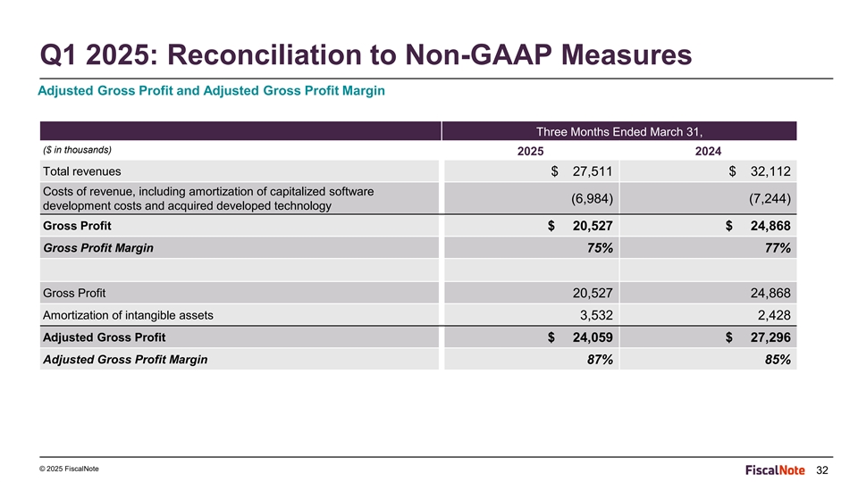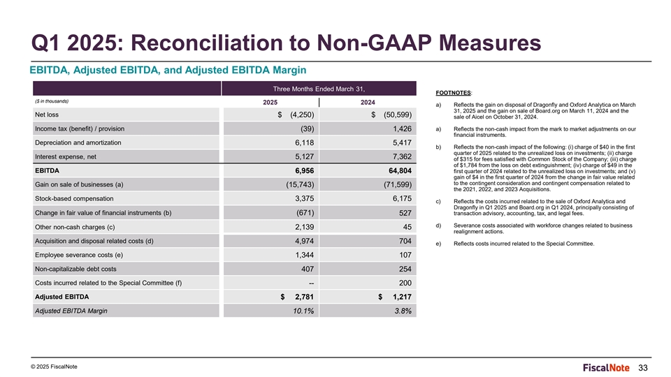 Q1 2025: Reconciliation to Non-GAAP Measures Adjusted Gross Profit and Adjusted Gross Profit Margin Three Months Ended March 31, ($ in thousands) 2025 2024 Total revenues $ 27,511 $ 32,112 Costs of revenue, including amortization of capitalized software (6,984) (7,244) development costs and acquired developed technology Gross Profit $ 20,527 $ 24,868 Gross Profit Margin 75% 77% Gross Profit 20,527 24,868 Amortization of intangible assets 3,532 2,428 Adjusted Gross Profit $ 24,059 $ 27,296 Adjusted Gross Profit Margin 87% 85% © 2025 FiscalNote 32