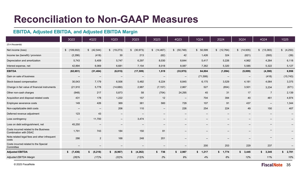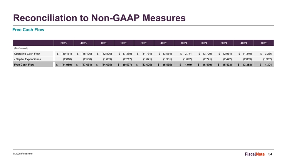 Reconciliation to Non-GAAP Measures Free Cash Flow 3Q22 4Q22 1Q23 2Q23 3Q23 4Q23 1Q24 2Q24 3Q24 4Q24 1Q25 ($ in thousands) Operating Cash Flow $ (39,151) $ (15,126) $ (12,826) $ (7,380) $ (11,734) $ (3,554) $ 2,741 $ (3,729) $ (2,961) $ (1,349) $ 3,286 - Capital Expenditures (2,818) (2,508) (1,869) (2,217) (1,871) (1,981) (1,692) (2,741) (2,442) (2,009) (1,982) Free Cash Flow $ (41,969) $ (17,634) $ (14,695) $ (9,597) $ (13,605) $ (5,535) $ 1,049 $ (6,470) $ (5,403) $ (3,358) $ 1,304 © 2025 FiscalNote 34