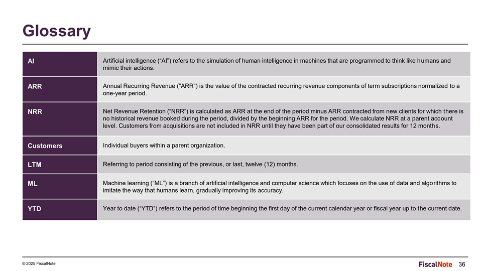 Glossary Artificial intelligence (“AI”) refers to the simulation of human intelligence in machines that are programmed to think like humans and AI mimic their actions. Annual Recurring Revenue (“ARR”) is the value of the contracted recurring revenue components of term subscriptions normalized to a ARR one-year period. Net Revenue Retention (“NRR”) is calculated as ARR at the end of the period minus ARR contracted from new clients for which there is NRR no historical revenue booked during the period, divided by the beginning ARR for the period. We calculate NRR at a parent account level. Customers from acquisitions are not included in NRR until they have been part of our consolidated results for 12 months. Individual buyers within a parent organization. Customers Referring to period consisting of the previous, or last, twelve (12) months. LTM Machine learning (“ML”) is a branch of artificial intelligence and computer science which focuses on the use of data and algorithms to ML imitate the way that humans learn, gradually improving its accuracy. Year to date (“YTD”) refers to the period of time beginning the first day of the current calendar year or fiscal year up to the current date. YTD © 2025 FiscalNote 36