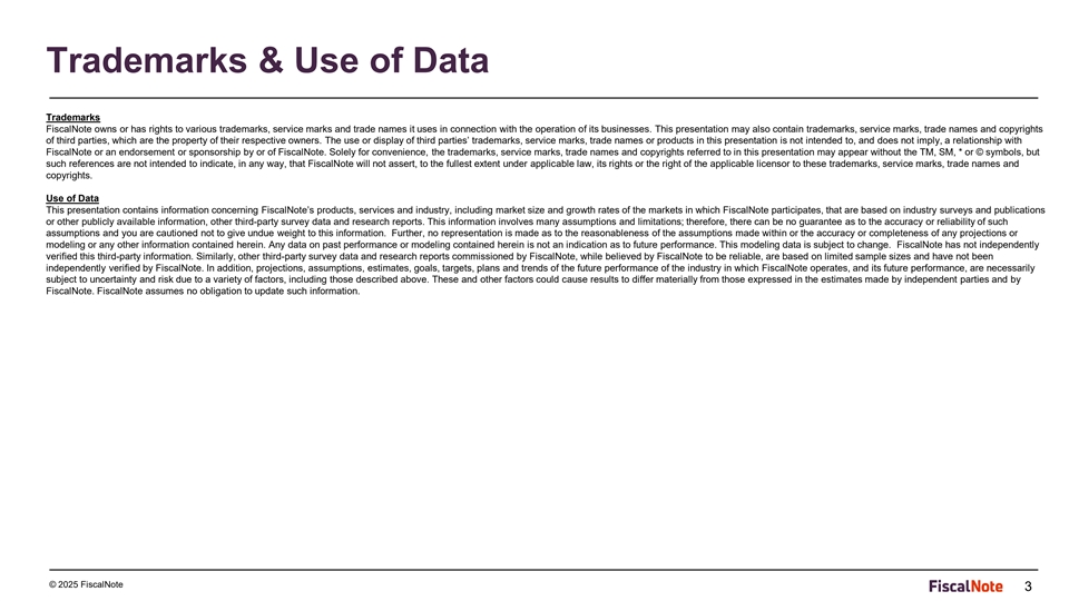 Safe Harbor Statement Safe Harbor Statement Certain statements herein may be considered forward-looking statements within the meaning of the Private Securities Litigation Reform Act of 1995. Forward-looking statements generally relate to future events or FiscalNote’s future financial or operating performance. For example, statements regarding FiscalNote’s financial outlook for future periods, expectations regarding profitability, capital resources and anticipated growth in the industry in which FiscalNote operates are forward-looking statements. In some cases, you can identify forward-looking statements by terminology such as “pro forma,” “may,” “should,” “could,” “might,” “plan,” “possible,” “project,” “strive,” “budget,” “forecast,” “expect,” “intend,” “will,” “estimate,” “anticipate,” “believe,” “predict,” “potential” or “continue,” or the negatives of these terms or variations of them or similar terminology. Such forward-looking statements are subject to risks, uncertainties, and other important factors that could cause actual results to differ materially from those expressed or implied by such forward-looking statements. Factors that may impact such forward-looking statements include: • FiscalNote’s concentration of revenues from U.S. government agencies, changes in the U.S. government spending priorities, dependence on winning or renewing U.S. government contracts, delay, disruption or unavailability of funding on U.S. government contracts, and the U.S. government’s right to modify, delay, curtail or terminate contracts; • FiscalNote’s ability to successfully execute on its strategy to achieve and sustain organic growth through a focus on its core Policy business, including risks to FiscalNote’s ability to develop, enhance, and integrate its existing platforms, products, and services, bring highly useful, reliable, secure and innovative products, product features and services to market, attract new customers, retain existing customers, expand its products and service offerings with existing customers, expand into geographic markets or identify other opportunities for growth; • FiscalNote’s future capital requirements, as well as its ability to service its repayment obligations and maintain compliance with covenants and restrictions under its existing debt agreements; • demand for FiscalNote’s services and the drivers of that demand; • the impact of cost reduction initiatives undertaken by FiscalNote; • risks associated with international operations, including compliance complexity and costs, increased exposure to fluctuations in currency exchange rates, political, social and economic instability, and supply chain disruptions; • FiscalNote’s ability to introduce new features, integrations, capabilities, and enhancements to its products and services, as well as obtain and maintain accurate, comprehensive, or reliable data to support its products and services; • FiscalNote's reliance on third-party systems and data, its ability to integrate such systems and data with its solutions and its potential inability to continue to support integration; • FiscalNote’s ability to maintain and improve its methods and technologies, and anticipate new methods or technologies, for data collection, organization, and analysis to support its products and services; • potential technical disruptions, cyberattacks, security, privacy or data breaches or other technical or security incidents that affect FiscalNote’s networks or systems or those of its service providers; • competition and competitive pressures in the markets in which FiscalNote operates, including larger well-funded companies shifting their existing business models to become more competitive with FiscalNote; • FiscalNote’s ability to comply with laws and regulations in connection with selling products and services to U.S. and foreign governments and other highly regulated industries; • FiscalNote’s ability to retain or recruit key personnel; • FiscalNote’s ability to adapt its products and services for changes in laws and regulations or public perception, or changes in the enforcement of such laws, relating to artificial intelligence, machine learning, data privacy and government contracts; • adverse general economic and market conditions reducing spending on our products and services; • the outcome of any known and unknown litigation and regulatory proceedings; • FiscalNote’s ability to maintain public company-quality internal control over financial reporting; and • FiscalNote’s ability to protect and maintain its brands and other intellectual property rights. These and other factors discussed in FiscalNote’s SEC filings, including its most recent reports on Forms 10-K and 10-Q, particularly the Risk Factors sections of those reports, could cause actual results to differ materially from those indicated by the forward-looking statements made herein. These forward-looking statements are based upon estimates and assumptions that, while considered reasonable by FiscalNote and its management, are inherently uncertain. Nothing herein should be regarded as a representation by any person that the forward-looking statements set forth herein will occur or that any of the contemplated results of such forward-looking statements will be achieved. You should not place undue reliance on forward-looking statements, which speak only as of the date they are made. FiscalNote undertakes no obligation to update or revise any forward-looking statements, whether as a result of new information, future events or otherwise, except as may be required under applicable securities laws.. FiscalNote assumes no obligation to update such information. © 2025 FiscalNote 2