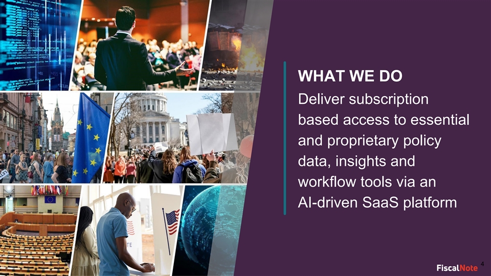 Trademarks & Use of Data Trademarks FiscalNote owns or has rights to various trademarks, service marks and trade names it uses in connection with the operation of its businesses. This presentation may also contain trademarks, service marks, trade names and copyrights of third parties, which are the property of their respective owners. The use or display of third parties’ trademarks, service marks, trade names or products in this presentation is not intended to, and does not imply, a relationship with FiscalNote or an endorsement or sponsorship by or of FiscalNote. Solely for convenience, the trademarks, service marks, trade names and copyrights referred to in this presentation may appear without the TM, SM, * or © symbols, but such references are not intended to indicate, in any way, that FiscalNote will not assert, to the fullest extent under applicable law, its rights or the right of the applicable licensor to these trademarks, service marks, trade names and copyrights. Use of Data This presentation contains information concerning FiscalNote’s products, services and industry, including market size and growth rates of the markets in which FiscalNote participates, that are based on industry surveys and publications or other publicly available information, other third-party survey data and research reports. This information involves many assumptions and limitations; therefore, there can be no guarantee as to the accuracy or reliability of such assumptions and you are cautioned not to give undue weight to this information. Further, no representation is made as to the reasonableness of the assumptions made within or the accuracy or completeness of any projections or modeling or any other information contained herein. Any data on past performance or modeling contained herein is not an indication as to future performance. This modeling data is subject to change. FiscalNote has not independently verified this third-party information. Similarly, other third-party survey data and research reports commissioned by FiscalNote, while believed by FiscalNote to be reliable, are based on limited sample sizes and have not been independently verified by FiscalNote. In addition, projections, assumptions, estimates, goals, targets, plans and trends of the future performance of the industry in which FiscalNote operates, and its future performance, are necessarily subject to uncertainty and risk due to a variety of factors, including those described above. These and other factors could cause results to differ materially from those expressed in the estimates made by independent parties and by FiscalNote. FiscalNote assumes no obligation to update such information. © 2025 FiscalNote 3