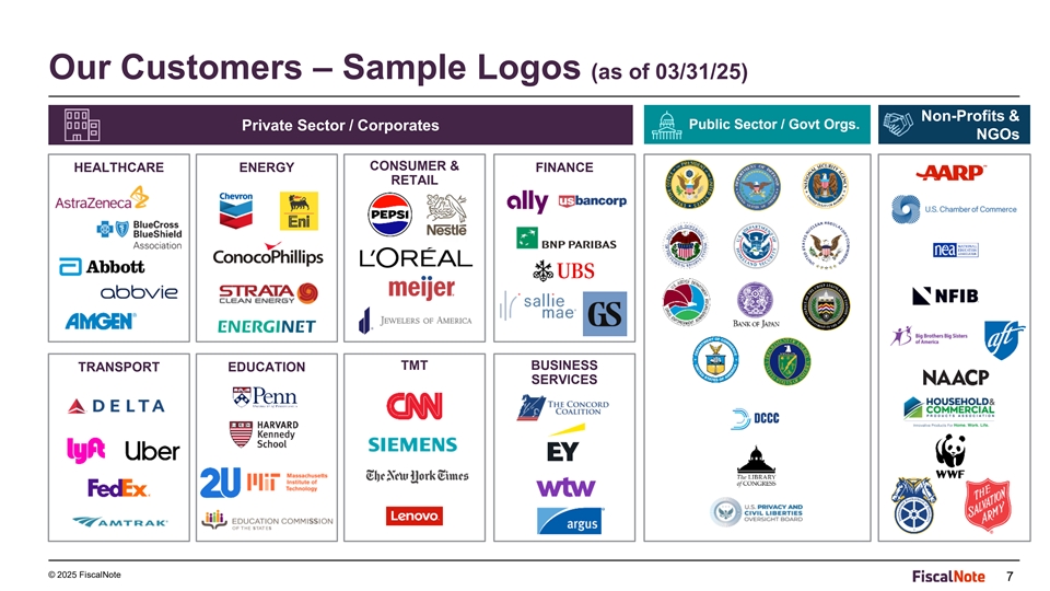 Large Market With a Growing Need for Solutions Increasingly complex world of regulations and policy making Enterprise No such thing as an unregulated entity anymore Info Solutions 1 TAM: $314B Relevant professionals have increasing seniority and responsibility Legal & Use of technology and AI is expanding in a rapidly changing environment Regulatory Info 2 TAM: $40B Opportunity to disrupt manual workflow in large adjacencies Our Solution: An AI-powered platform that transforms uncertainty into insight. 1. Outsell: Market landscape (as of August 12, 2021), denotes estimated TAM in 2020. 2. Outsell: Market landscape (as of April 24, 2023) © 2025 FiscalNote 6