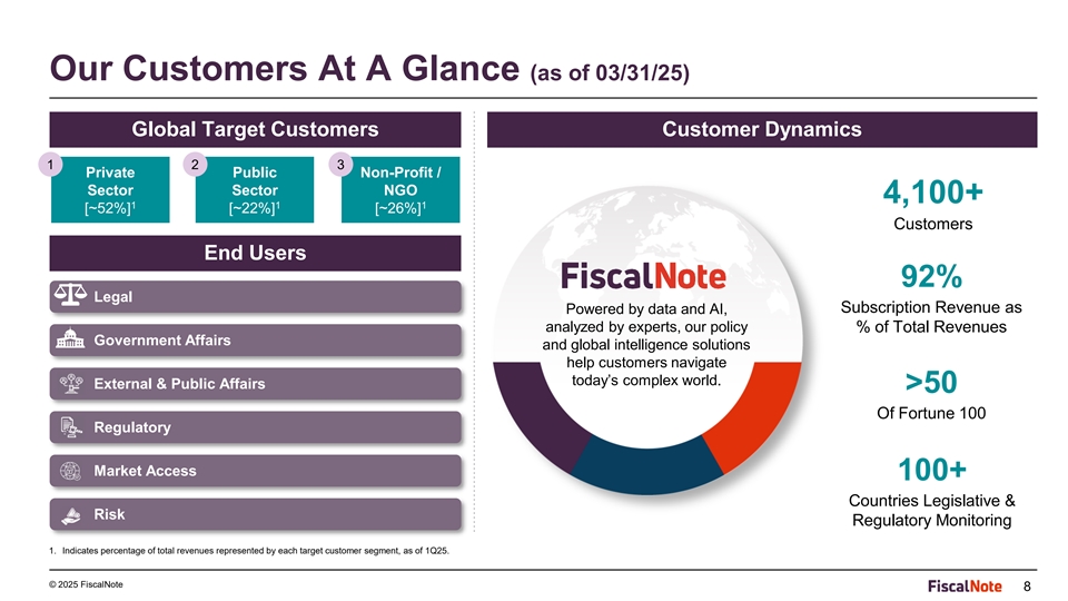 Our Customers – Sample Logos (as of 03/31/25) Non-Profits & Public Sector / Govt Orgs. Private Sector / Corporates NGOs CONSUMER & HEALTHCARE ENERGY FINANCE RETAIL TMT BUSINESS TRANSPORT EDUCATION SERVICES © 2025 FiscalNote 7
