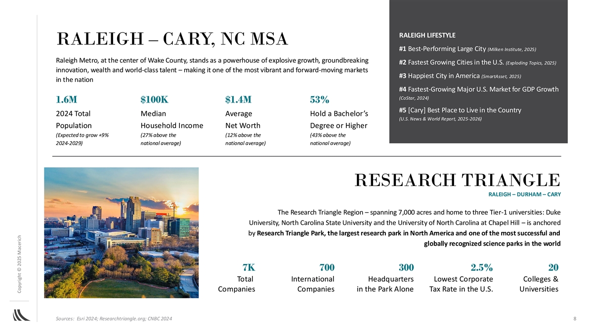 The Raleigh-Cary, NC MSA stands as a powerhouse of explosive growth, groundbreaking innovation, wealth and world-class talent – making it one of the most vibrant and forward-moving markets in the nation. The Research Triangle Region is anchored by Research Triangle Park (“RTP”) – the largest research park in North American and one of the most successful and globally recognized science parks in the world. RTP spans 7,000 acres and is home to 250+ businesses and three Tier-1 universities: Duke University, North Carolina State University and the University of North Carolina at Chapel Hill.