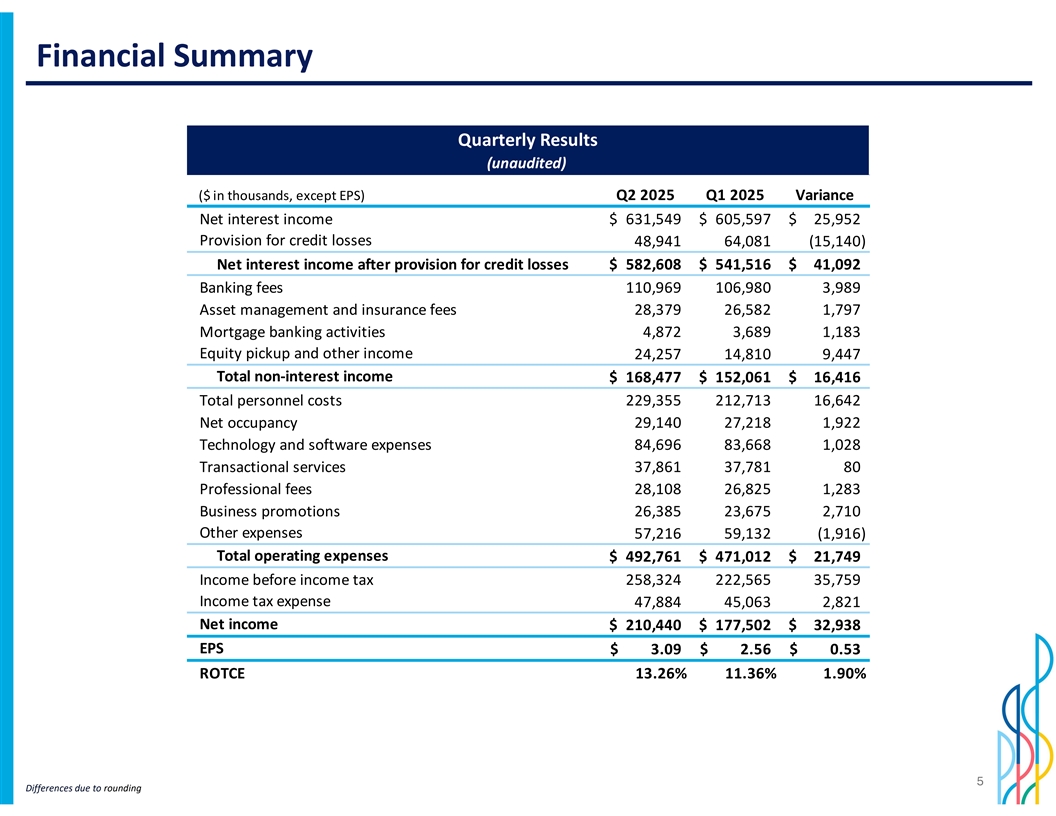 | • | 2025年6月30日現在の普通株式Tier1比率は15.91%、1株当たり普通株式は87.31ドル、1株当たり有形純資産は3.39ドル増の75.41ドル。 |