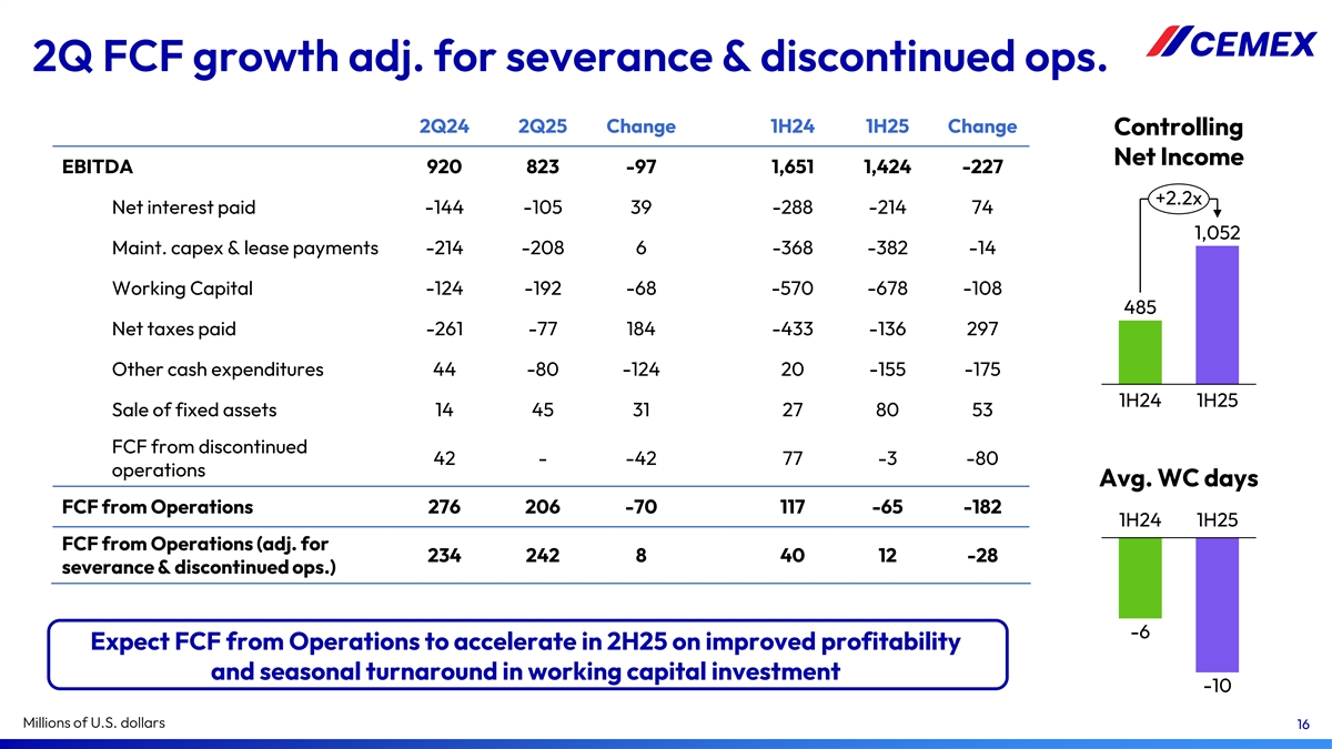 Cemex provided full-year EBITDA guidance for flat performance vs. 2024 with potential upside. The company expects free cash flow to accelerate in the second half, supported by improved profitability and seasonal recovery of working capital investment.