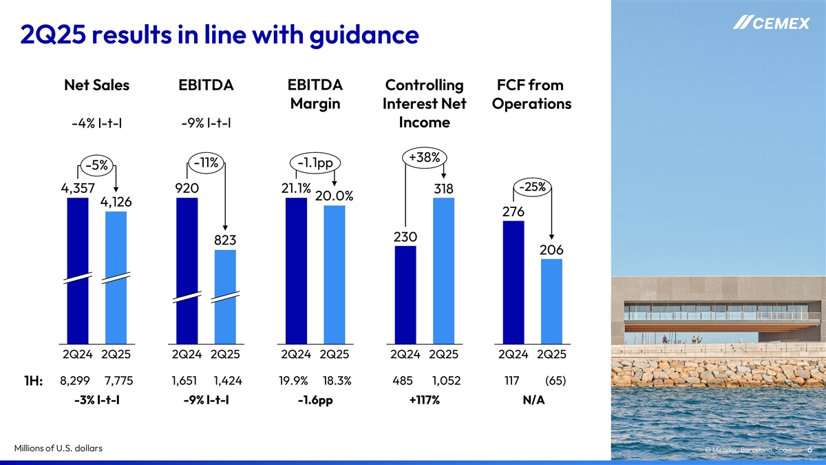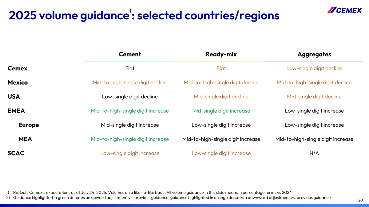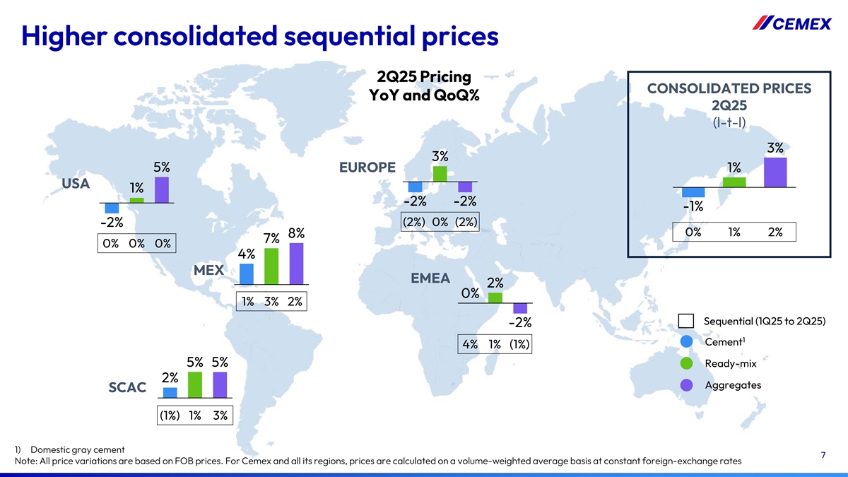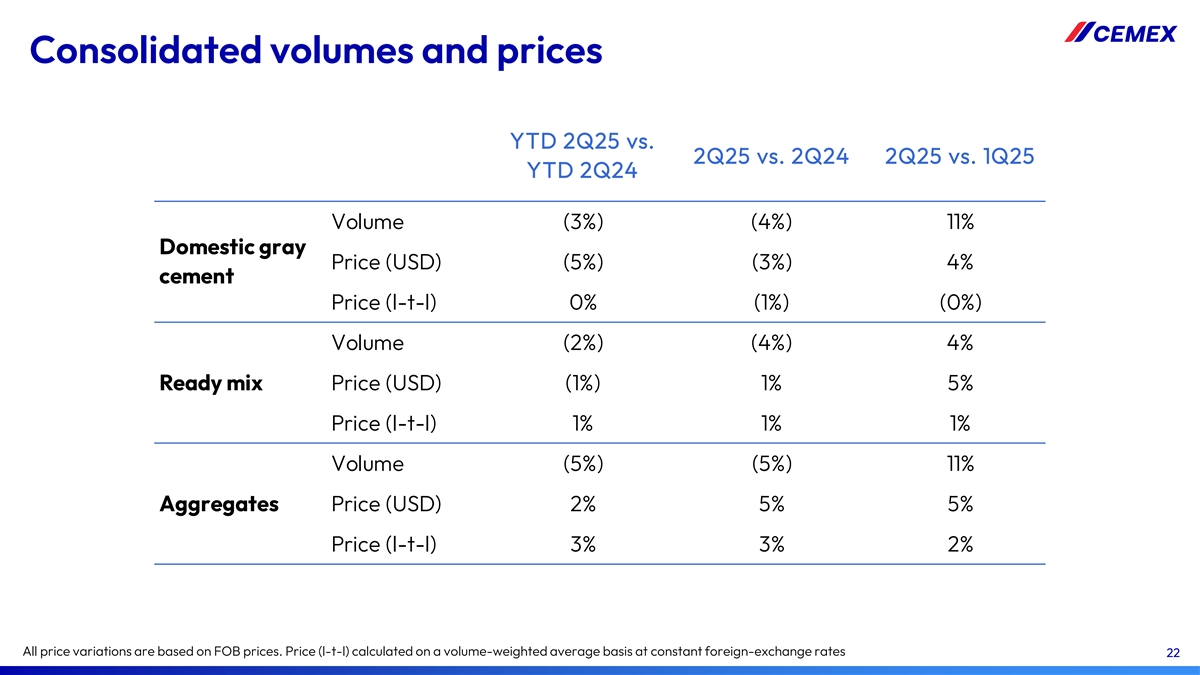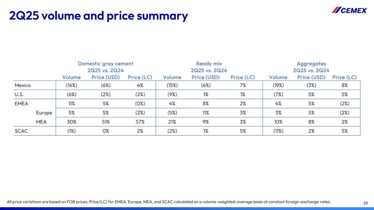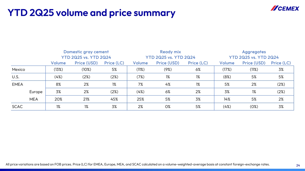 YTD 2Q25 volume and price summary Domestic gray cement Ready mix Aggregates YTD 2Q25 vs. YTD 2Q24 YTD 2Q25 vs. YTD 2Q24 YTD 2Q25 vs. YTD 2Q24 Volume Price (USD) Price (LC) Volume Price (USD) Price (LC) Volume Price (USD) Price (LC) Mexico (13%) (10%) 5% (11%) (9%) 6% (17%) (11%) 3% U.S. (4%) (2%) (2%) (7%) 1% 1% (8%) 5% 5% EMEA 8% 2% 1% 7% 4% 1% 5% 2% (2%) Europe 3% 2% (2%) (4%) 6% 2% 3% 1% (2%) MEA 20% 21% 45% 25% 5% 3% 14% 5% 2% SCAC 1% 1% 3% 2% 0% 5% (4%) (0%) 3% All price variations are based on FOB prices. Price (LC) for EMEA, Europe, MEA, and SCAC calculated on a volume-weighted-average basis at constant foreign-exchange rates. 24