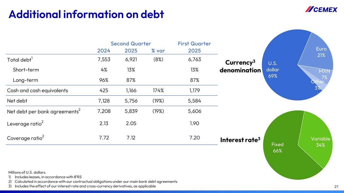 Additional information on debt Second Quarter First Quarter Euro 2024 2025 % var 2025 21% 1 7,553 6,921 (8%) 6,763 Total debt 3 Currency U.S. Short-term 4% 13% 13% dollar denomination MXN 69% 7% Long-term 96% 87% 87% Other 3% Cash and cash equivalents 425 1,166 174% 1,179 Net debt 7,128 5,756 (19%) 5,584 2 7,208 5,839 (19%) 5,606 Net debt per bank agreements 2 2.13 2.05 1.90 Leverage ratio 2 7.72 7.12 7.20 Coverage ratio 3 Variable Interest rate Fixed 34% 66% Millions of U.S. dollars. 1) Includes leases, in accordance with IFRS 2) Calculated in accordance with our contractual obligations under our main bank debt agreements 3) Includes the effect of our interest rate and cross-currency derivatives, as applicable 27