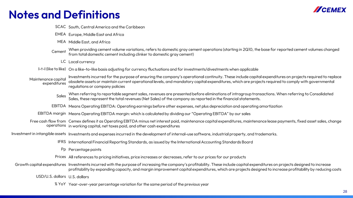 Notes and Definitions SCAC South, Central America and the Caribbean EMEA Europe, Middle East and Africa MEA Middle East, and Africa When providing cement volume variations, refers to domestic gray cement operations (starting in 2Q10, the base for reported cement volumes changed Cement from total domestic cement including clinker to domestic gray cement) LC Local currency l-t-l (like to like) On a like-to-like basis adjusting for currency fluctuations and for investments/divestments when applicable Investments incurred for the purpose of ensuring the company’s operational continuity. These include capital expenditures on projects required to replace Maintenance capital obsolete assets or maintain current operational levels, and mandatory capital expenditures, which are projects required to comply with governmental expenditures regulations or company policies When referring to reportable segment sales, revenues are presented before eliminations of intragroup transactions. When referring to Consolidated Sales Sales, these represent the total revenues (Net Sales) of the company as reported in the financial statements. EBITDA Means Operating EBITDA: Operating earnings before other expenses, net plus depreciation and operating amortization EBITDA margin Means Operating EBITDA margin: which is calculated by dividing our “Operating EBITDA” by our sales Free cash flow from Cemex defines it as Operating EBITDA minus net interest paid, maintenance capital expenditures, maintenance lease payments, fixed asset sales, change operations in working capital, net taxes paid, and other cash expenditures Investment in intangible assets Investments and expenses incurred in the development of internal-use software, industrial property, and trademarks. IFRS International Financial Reporting Standards, as issued by the International Accounting Standards Board Pp Percentage points Prices All references to pricing initiatives, price increases or decreases, refer to our prices for our products Growth capital expenditures Investments incurred with the purpose of increasing the company’s profitability. These include capital expenditures on projects designed to increase profitability by expanding capacity, and margin improvement capital expenditures, which are projects designed to increase profitability by reducing costs USD/U.S. dollars U.S. dollars % YoY Year-over-year percentage variation for the same period of the previous year 28