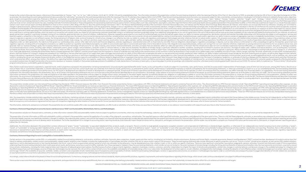 Except as the context otherwise may require, references in this presentation to “Cemex,” “we,” “us,” or “our,” refer to Cemex, S.A.B. de C.V. (NYSE: CX) and its consolidated entities. The information included in this presentation contains forward-looking statements within the meaning of Section 27A of the U.S. Securities Act of 1933, as amended, and Section 21E of the U.S. Securities Exchange Act of 1934, as amended. We intend these forward-looking statements to be covered by the “safe harbor” provisions for forward-looking statements within the meaning of the U.S. Private Securities Litigation Reform Act of 1995. These forward-looking statements and information are necessarily subject to risks, uncertainties, and assumptions, including but not limited to statements related to Cemex’s plans, objectives, goals, targets, and expectations (operative, financial or otherwise), and typically can be identified by the use of words such as, but not limited to, “will,” “may,” “assume,” “might,” “should,” “could,” “continue,” “would,” “can,” “consider,” “anticipate,” “estimate,” “expect,” “envision,” “plan,” “believe,” “foresee,” “predict,” “potential,” “target”, “goal”, “strategy,” “intend,” “aimed”, or other forward-looking words. These forward-looking statements reflect, as of the date such forward-looking statements are made, unless otherwise indicated, our current expectations and projections about future events based on our knowledge of present facts and circumstances and assumptions about future events. Although Cemex believes that its expectations are reasonable, it can give no assurance that these expectations will prove to be correct, and actual results may vary, including materially from historical results or those anticipated by forward-looking statements due to various factors. Among others, such risks, uncertainties, assumptions, and other important factors that could cause results and any guidance presented in this presentation to differ, or that otherwise could have an impact on us, include those discussed in Cemex’s most recent annual report and those detailed from time to time in Cemex’s other filings with the U.S. Securities and Exchange Commission (“SEC”), the Mexican National Banking and Securities Commission (Comisión Nacional Bancaria y de Valores) and the Mexican Stock Exchange (Bolsa Mexicana de Valores), which factors are incorporated herein by reference, including, but not limited to: changes in general economic, political and social conditions, including new governments and decisions implemented by such new governments, changes in laws or regulations in the countries in which we do business, elections, changes in inflation, interest and foreign exchange rates, employment levels, population growth, any slowdown in the flow of remittances into countries where we operate, consumer confidence and the liquidity of the financial and capital markets in Mexico, the United States of America, the European Union (the “EU”), the United Kingdom, or other countries in which we operate; the cyclical activity of the construction sector and reduced construction activity in our end markets or reduced use in our end markets for our products; our exposure to sectors that impact our and our clients’ businesses, particularly those operating in the commercial and residential construction sectors, and the public and private infrastructure and energy sectors; volatility in pension plan asset values and liabilities, which may require cash or other contributions to the pension plans; changes in spending levels for residential and commercial construction and general infrastructure projects; the availability of short- term credit lines or working capital facilities, which can assist us in connection with market cycles; any impact of not maintaining investment grade debt rating or not obtaining investment grade debt ratings from additional rating agencies on our cost of capital and on the cost of the products and services we purchase; availability of raw materials and related fluctuating prices of raw materials, as well as of goods and services in general, in particular increases in prices of raw materials, good and services, as a result of inflation, trade barriers, measures imposed by governments or as a result of conflicts between countries that disrupt supply chains; our ability to maintain and expand our distribution network and maintain favorable relationships with third parties who supply us with equipment, services and essential suppliers; competition in the markets in which we offer our products and services; the impact of environmental cleanup costs and other remedial actions, and other environmental, climate and related liabilities relating to existing and/or divested businesses, assets and/or operations; our ability to secure and permit aggregates reserves in strategically located areas in amounts that our operations require to operate or operate in a cost-efficient manner; the timing and amount of federal, state, and local funding for infrastructure; changes in our effective tax rate; our ability to comply with regulations and implement technologies and other initiatives that aim to reduce and/or capture CO emissions and comply with related carbon emissions regulations in place in the jurisdictions where we have 2 operations; the legal and regulatory environment, including environmental, climate, trade, energy, tax, antitrust, sanctions, export controls, construction, human rights and labor welfare, and acquisition-related rules and regulations in the countries and regions in which we have operations; the effects of currency fluctuations on our results of operations and financial condition; our ability to satisfy our obligations under our debt agreements, the indentures that govern our outstanding notes, and our other debt instruments and financial obligati