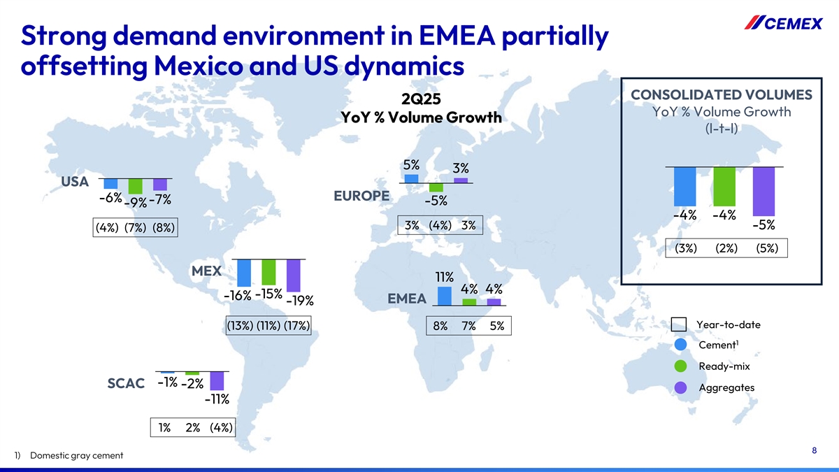 Higher consolidated sequential prices 2Q25 Pricing CONSOLIDATED PRICES YoY and QoQ% 2Q25 (l-t-l) 3% 3% 5% EUROPE 1% USA 1% -2% -2% -1% (2%) 0% (2%) -2% 0% 1% 2% 8% 7% 0% 0% 0% 4% MEX EMEA 2% 0% 1% 3% 2% Sequential (1Q25 to 2Q25) -2% 1 Cement 4% 1% (1%) 5% 5% Ready-mix 2% Aggregates SCAC (1%) 1% 3% 1) Domestic gray cement 7 Note: All price variations are based on FOB prices. For Cemex and all its regions, prices are calculated on a volume-weighted average basis at constant foreign-exchange rates