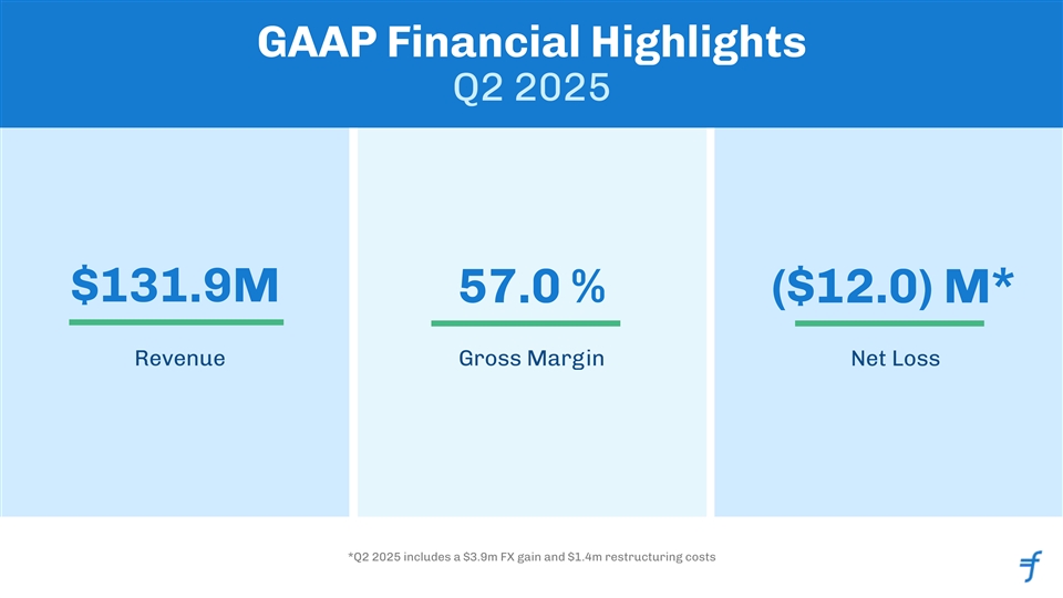 GAAP Financial Highlights Q2 2025 $131.9M 57.0 % ($12.0) M* Revenue Gross Margin Net Loss *Q2 2025 includes a $3.9m FX gain and $1.4m restructuring costs