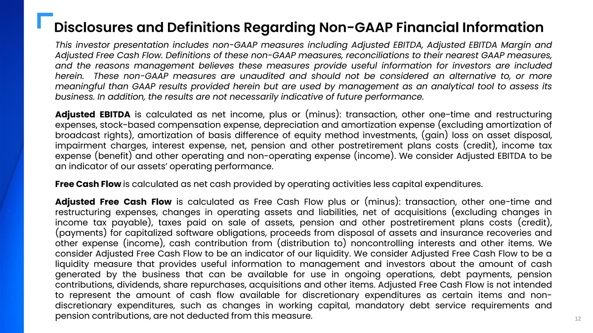 Disclosures and Definitions Regarding Non-GAAP Financial Information This investor presentation includes non-GAAP measures including Adjusted EBITDA, Adjusted EBITDA Margin and Adjusted Free Cash Flow. Definitions of these non-GAAP measures, reconciliations to their nearest GAAP measures, and the reasons management believes these measures provide useful information for investors are included herein. These non-GAAP measures are unaudited and should not be considered an alternative to, or more meaningful than GAAP results provided herein but are used by management as an analytical tool to assess its business. In addition, the results are not necessarily indicative of future performance. Adjusted EBITDA is calculated as net income, plus or (minus): transaction, other one-time and restructuring expenses, stock-based compensation expense, depreciation and amortization expense (excluding amortization of broadcast rights), amortization of basis difference of equity method investments, (gain) loss on asset disposal, impairment charges, interest expense, net, pension and other postretirement plans costs (credit), income tax expense (benefit) and other operating and non-operating expense (income). We consider Adjusted EBITDA to be an indicator of our assets’ operating performance. Free Cash Flow is calculated as net cash provided by operating activities less capital expenditures. Adjusted Free Cash Flow is calculated as Free Cash Flow plus or (minus): transaction, other one-time and restructuring expenses, changes in operating assets and liabilities, net of acquisitions (excluding changes in income tax payable), taxes paid on sale of assets, pension and other postretirement plans costs (credit), (payments) for capitalized software obligations, proceeds from disposal of assets and insurance recoveries and other expense (income), cash contribution from (distribution to) noncontrolling interests and other items. We consider Adjusted Free Cash Flow to be an indicator of our liquidity. We consider Adjusted Free Cash Flow to be a liquidity measure that provides useful information to management and investors about the amount of cash generated by the business that can be available for use in ongoing operations, debt payments, pension contributions, dividends, share repurchases, acquisitions and other items. Adjusted Free Cash Flow is not intended to represent the amount of cash flow available for discretionary expenditures as certain items and non- discretionary expenditures, such as changes in working capital, mandatory debt service requirements and pension contributions, are not deducted from this measure. 12