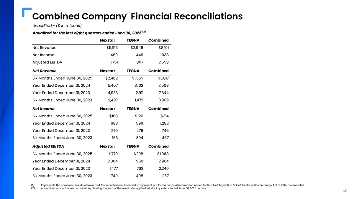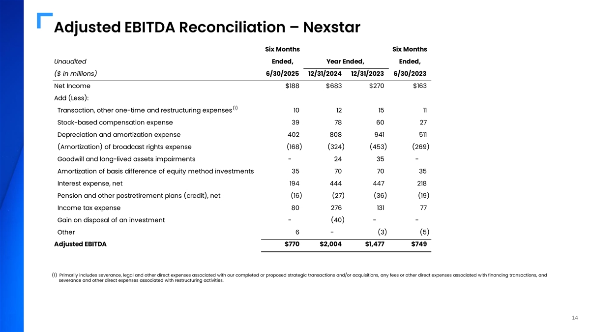 (1) Combined Company Financial Reconciliations Unaudited - ($ in millions) (2) Anualized for the last eight quarters ended June 30, 2025 Nexstar TEGNA Combined Net Revenue $5,153 $2,948 $8,101 Net Income 489 449 9 38 Adjusted EBITDA 1,751 807 2,558 Net Revenue Nexstar TEGNA Combined Six Months Ended June 30, 2025 $2,462 $1,355 $3,817 Year Ended December 31, 2024 5,407 3,102 8 ,509 Year Ended December 31, 2023 4,933 2,911 7,844 Six Months Ended June 30, 2023 2,497 1,472 3,969 Net Income Nexstar TEGNA Combined Six Months Ended June 30, 2025 $188 $126 $314 Year Ended December 31, 2024 683 599 1,282 Year Ended December 31, 2023 270 476 746 Six Months Ended June 30, 2023 163 30 4 467 Adjusted EBITDA Nexstar TEGNA Combined Six Months Ended June 30, 2025 $770 $298 $1,068 Year Ended December 31, 2024 2,004 960 2,964 Year Ended December 31, 2023 1,477 763 2,240 Six Months Ended June 30, 2023 749 408 1,157 (1) Represents the combined results of Nova and Teton and are not intended to represent pro forma financial information under Section 11 of Regulation S-X of the Securities Exchange Act of 1934, as amended. (2) Annualized amounts are calculated by dividing the sum of the results during the last eight quarters ended June 30, 2025 by two. 13