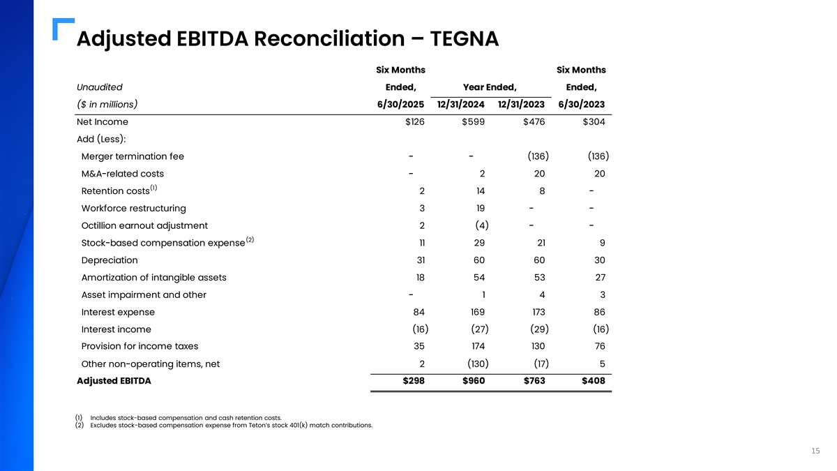 Adjusted EBITDA Reconciliation – Nexstar Six Months Six Months Unaudited Ended, Year Ended, Ended, ($ in millions) 6/30/2025 12/31/2024 12/31/2023 6/30/2023 Net Income $188 $683 $270 $163 Add (Less): (1) Transaction, other one-time and restructuring expenses 10 12 15 11 Stock-based compensation expense 39 78 60 27 Depreciation and amortization expense 402 808 9 41 511 (Amortization) of broadcast rights expense (168) (324) (453) (269) Goodwill and long-lived assets impairments - 24 35 - Amortization of basis difference of equity method investments 35 70 70 35 Interest expense, net 194 444 447 218 Pension and other postretirement plans (credit), net (16) ( 27) (36) (19) Income tax expense 80 276 131 77 Gain on disposal of an investment - (40) - - Other 6 - (3) (5) Adjusted EBITDA $770 $2,004 $1,477 $749 (1) Primarily includes severance, legal and other direct expenses associated with our completed or proposed strategic transactions and/or acquisitions, any fees or other direct expenses associated with financing transactions, and severance and other direct expenses associated with restructuring activities. 14