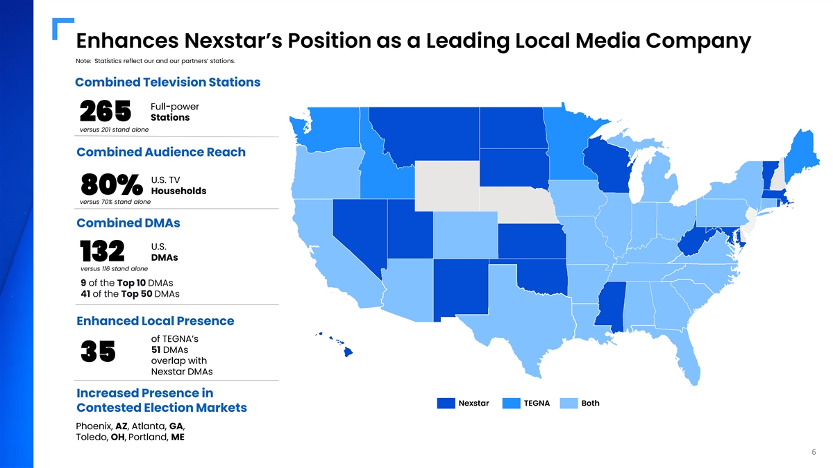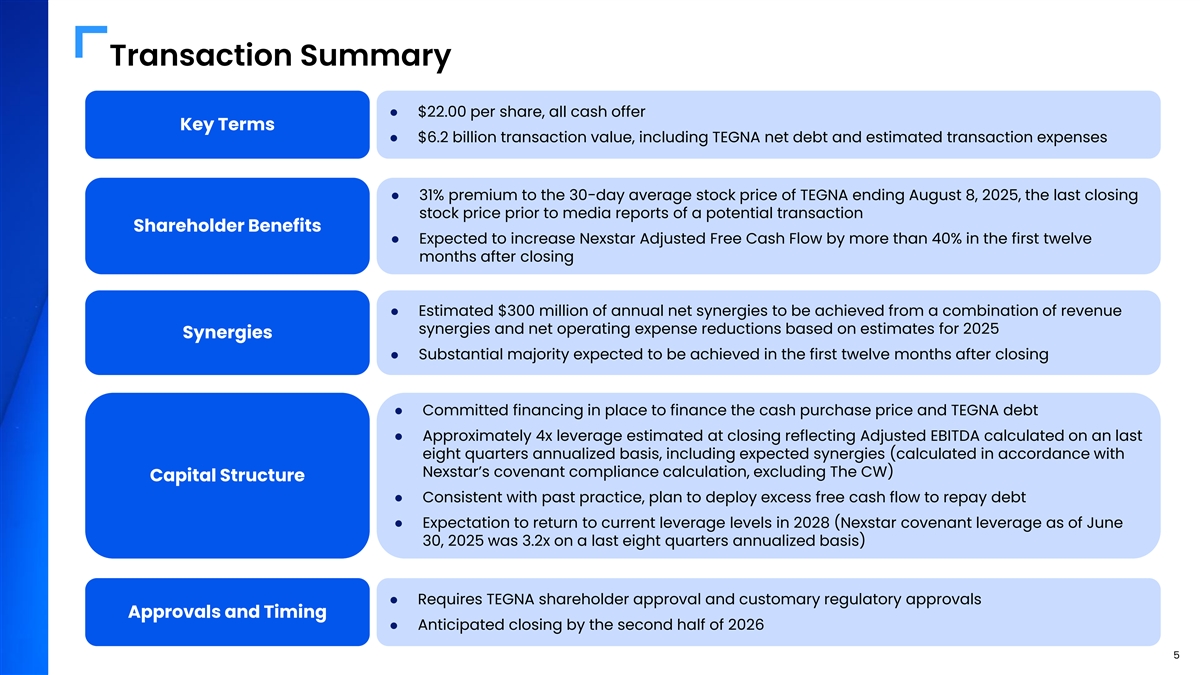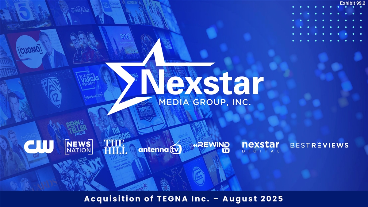 Transaction Summary ⚫ $22.00 per share, all cash offer Key Terms ⚫ $6.2 billion transaction value, including TEGNA net debt and estimated transaction expenses ⚫ 31% premium to the 30-day average stock price of TEGNA ending August 8, 2025, the last closing stock price prior to media reports of a potential transaction Shareholder Benefits ⚫ Expected to increase Nexstar Adjusted Free Cash Flow by more than 40% in the first twelve months after closing ⚫ Estimated $300 million of annual net synergies to be achieved from a combination of revenue synergies and net operating expense reductions based on estimates for 2025 Synergies ⚫ Substantial majority expected to be achieved in the first twelve months after closing ⚫ Committed financing in place to finance the cash purchase price and TEGNA debt ⚫ Approximately 4x leverage estimated at closing reflecting Adjusted EBITDA calculated on an last eight quarters annualized basis, including expected synergies (calculated in accordance with Nexstar’s covenant compliance calculation, excluding The CW) Capital Structure ⚫ Consistent with past practice, plan to deploy excess free cash flow to repay debt ⚫ Expectation to return to current leverage levels in 2028 (Nexstar covenant leverage as of June 30, 2025 was 3.2x on a last eight quarters annualized basis) ⚫ Requires TEGNA shareholder approval and customary regulatory approvals Approvals and Timing ⚫ Anticipated closing by the second half of 2026 5