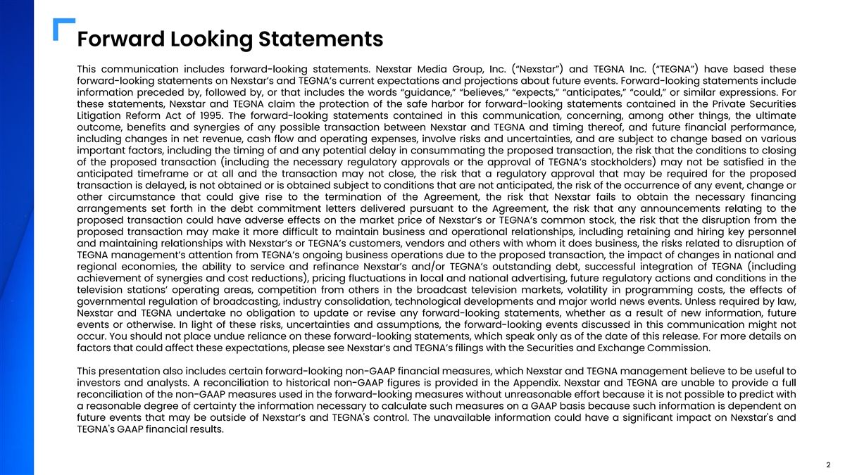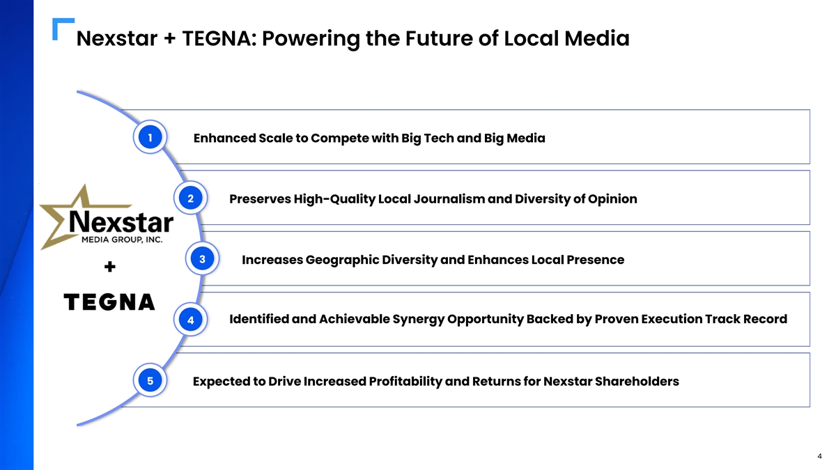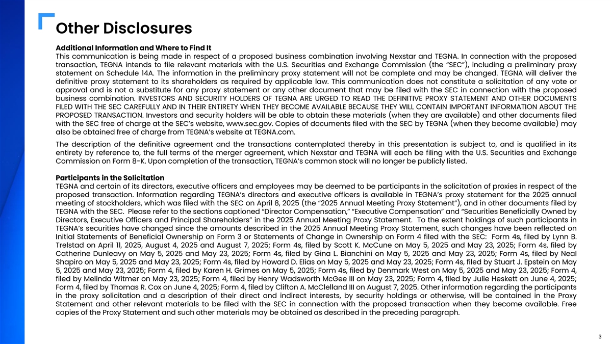 Other Disclosures Additional Information and Where to Find It This communication is being made in respect of a proposed business combination involving Nexstar and TEGNA. In connection with the proposed transaction, TEGNA intends to file relevant materials with the U.S. Securities and Exchange Commission (the “SEC”), including a preliminary proxy statement on Schedule 14A. The information in the preliminary proxy statement will not be complete and may be changed. TEGNA will deliver the definitive proxy statement to its shareholders as required by applicable law. This communication does not constitute a solicitation of any vote or approval and is not a substitute for any proxy statement or any other document that may be filed with the SEC in connection with the proposed business combination. INVESTORS AND SECURITY HOLDERS OF TEGNA ARE URGED TO READ THE DEFINITIVE PROXY STATEMENT AND OTHER DOCUMENTS FILED WITH THE SEC CAREFULLY AND IN THEIR ENTIRETY WHEN THEY BECOME AVAILABLE BECAUSE THEY WILL CONTAIN IMPORTANT INFORMATION ABOUT THE PROPOSED TRANSACTION. Investors and security holders will be able to obtain these materials (when they are available) and other documents filed with the SEC free of charge at the SEC’s website, www.sec.gov. Copies of documents filed with the SEC by TEGNA (when they become available) may also be obtained free of charge from TEGNA’s website at TEGNA.com. The description of the definitive agreement and the transactions contemplated thereby in this presentation is subject to, and is qualified in its entirety by reference to, the full terms of the merger agreement, which Nexstar and TEGNA will each be filing with the U.S. Securities and Exchange Commission on Form 8-K. Upon completion of the transaction, TEGNA’s common stock will no longer be publicly listed. Participants in the Solicitation TEGNA and certain of its directors, executive officers and employees may be deemed to be participants in the solicitation of proxies in respect of the proposed transaction. Information regarding TEGNA’s directors and executive officers is available in TEGNA’s proxy statement for the 2025 annual meeting of stockholders, which was filed with the SEC on April 8, 2025 (the “2025 Annual Meeting Proxy Statement”), and in other documents filed by TEGNA with the SEC. Please refer to the sections captioned “Director Compensation,” “Executive Compensation” and “Securities Beneficially Owned by Directors, Executive Officers and Principal Shareholders” in the 2025 Annual Meeting Proxy Statement. To the extent holdings of such participants in TEGNA’s securities have changed since the amounts described in the 2025 Annual Meeting Proxy Statement, such changes have been reflected on Initial Statements of Beneficial Ownership on Form 3 or Statements of Change in Ownership on Form 4 filed with the SEC: Form 4s, filed by Lynn B. Trelstad on April 11, 2025, August 4, 2025 and August 7, 2025; Form 4s, filed by Scott K. McCune on May 5, 2025 and May 23, 2025; Form 4s, filed by Catherine Dunleavy on May 5, 2025 and May 23, 2025; Form 4s, filed by Gina L. Bianchini on May 5, 2025 and May 23, 2025; Form 4s, filed by Neal Shapiro on May 5, 2025 and May 23, 2025; Form 4s, filed by Howard D. Elias on May 5, 2025 and May 23, 2025; Form 4s, filed by Stuart J. Epstein on May 5, 2025 and May 23, 2025; Form 4, filed by Karen H. Grimes on May 5, 2025; Form 4s, filed by Denmark West on May 5, 2025 and May 23, 2025; Form 4, filed by Melinda Witmer on May 23, 2025; Form 4, filed by Henry Wadsworth McGee III on May 23, 2025; Form 4, filed by Julie Heskett on June 4, 2025; Form 4, filed by Thomas R. Cox on June 4, 2025; Form 4, filed by Clifton A. McClelland III on August 7, 2025. Other information regarding the participants in the proxy solicitation and a description of their direct and indirect interests, by security holdings or otherwise, will be contained in the Proxy Statement and other relevant materials to be filed with the SEC in connection with the proposed transaction when they become available. Free copies of the Proxy Statement and such other materials may be obtained as described in the preceding paragraph. 3